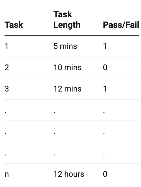 Inspired by METR's work on AI time-horizons (paper) I wanted to do the same for my WeirdML data. WeirdML is my benchmark — supported by METR and included in the Epoch AI benchmarking hub and Epoch Capabilities Index — asking LLMs to solve weird and unusual ML tasks (for more details see the WeirdML page).