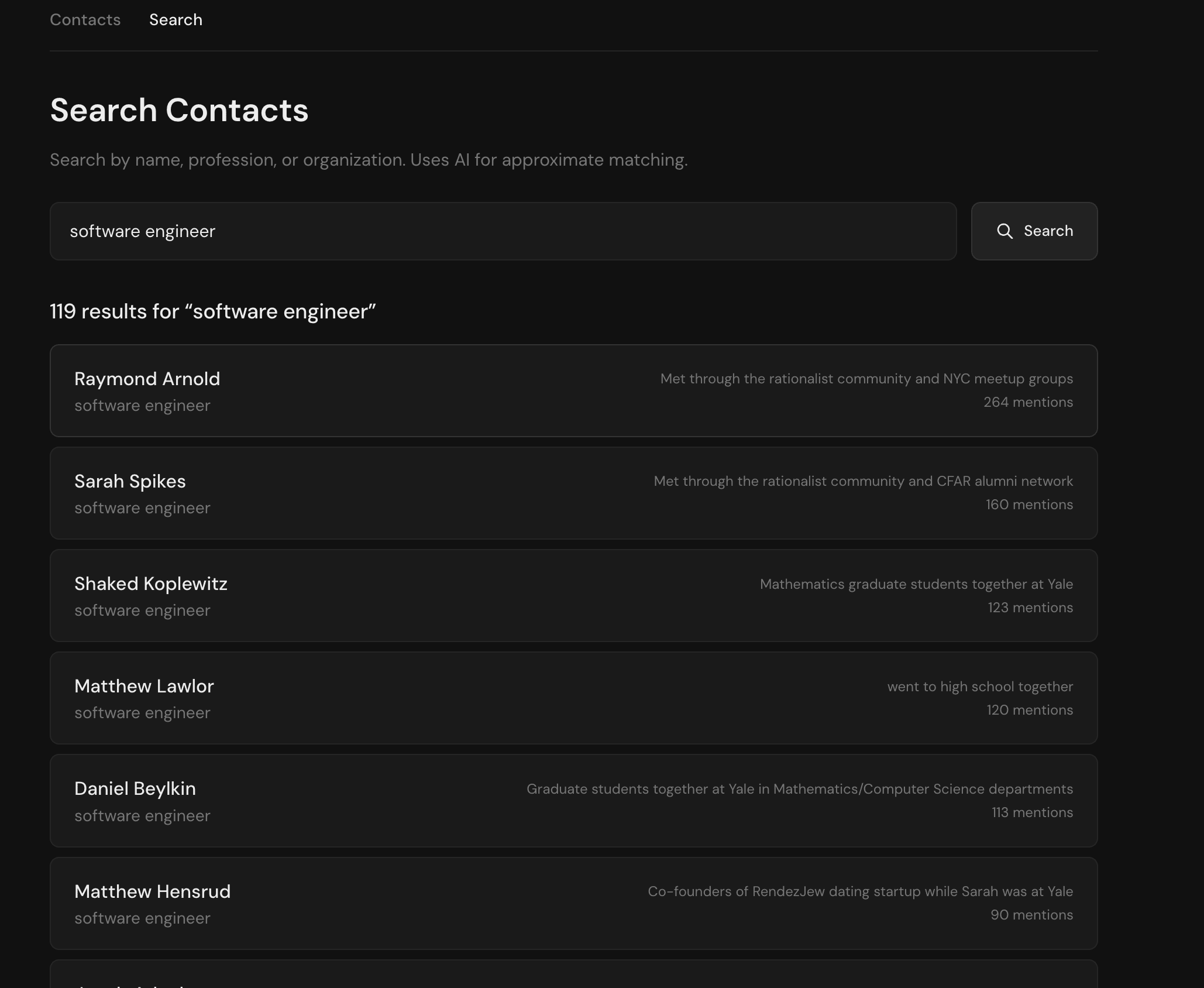So now I can search for things like “who do I know who’s a software engineer” or “who do I know in NYC”.
