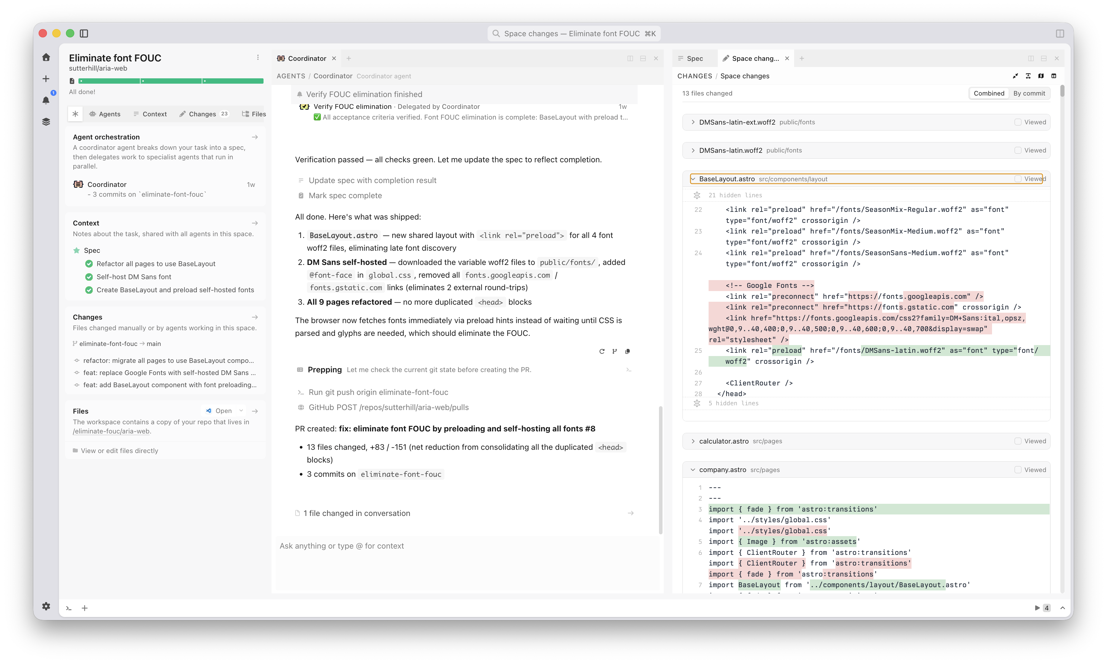 Then he kicked off a series of workspaces. The first one pulled the design tokens into Tailwind. The second started laying out the first page using those tokens. After that, he was able to break off into parallel workspaces, one for each page. Desktop layouts first, then separate passes for mobile.