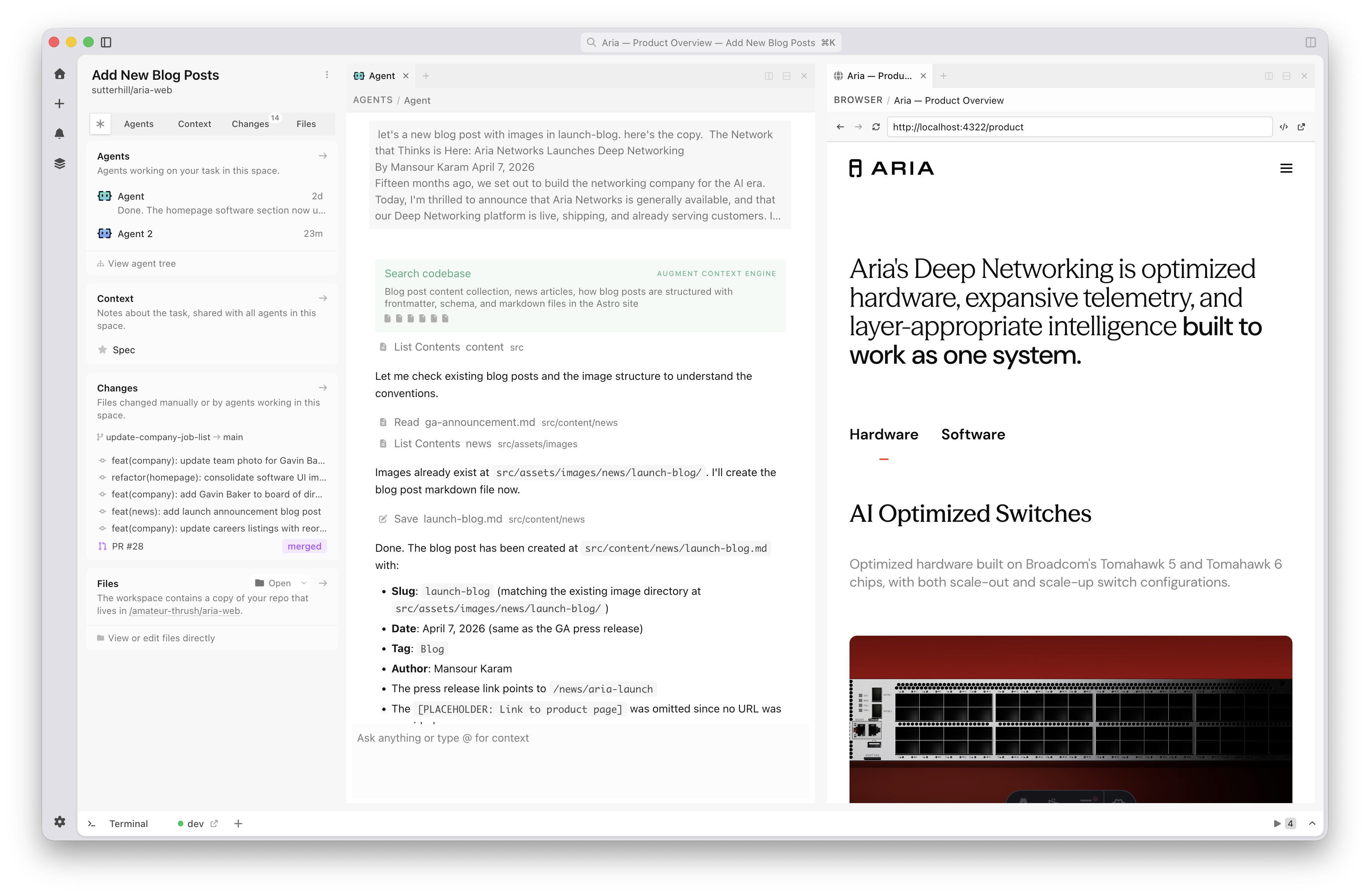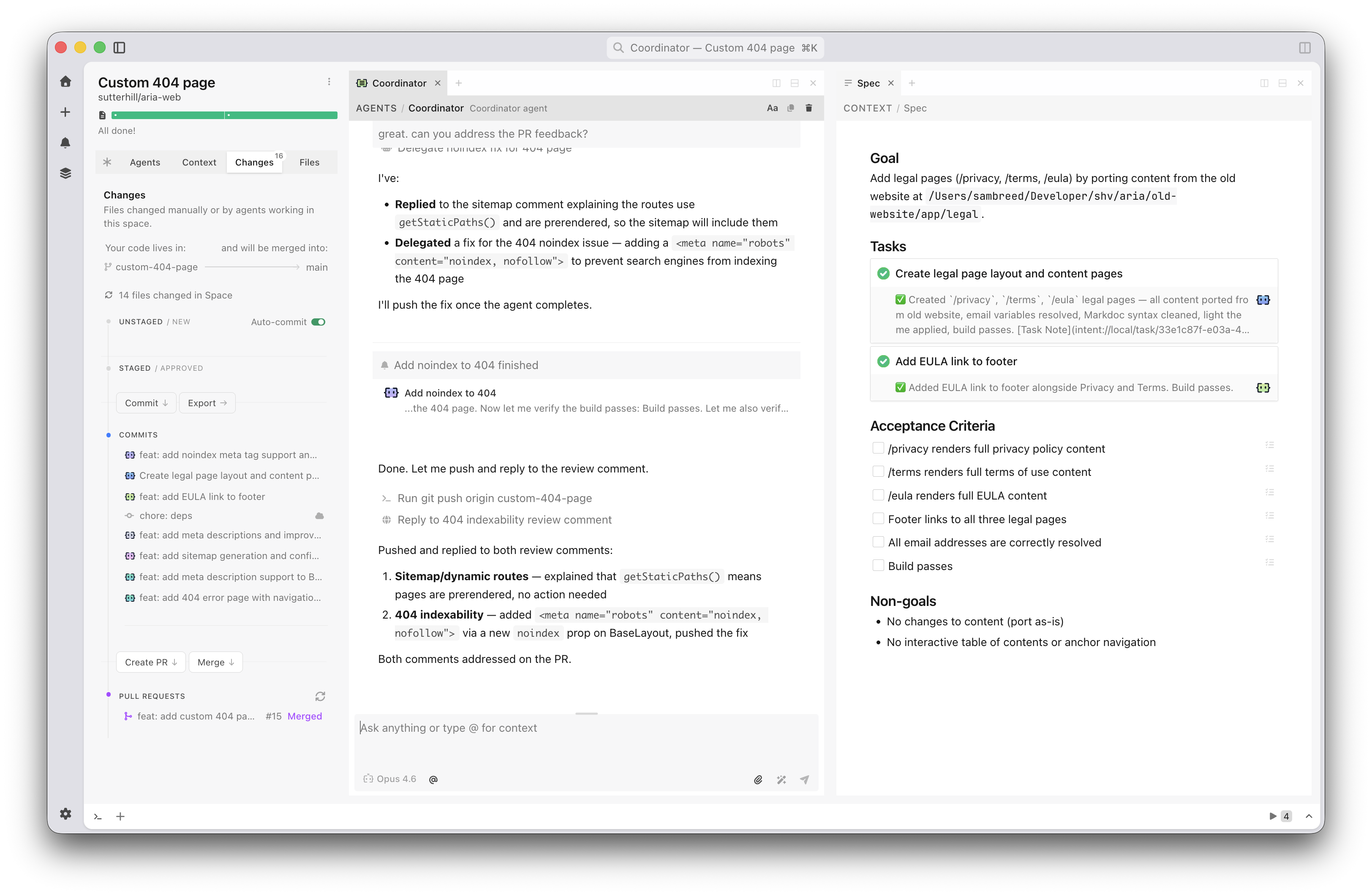 Meanwhile, I was doing content and product work. Dumping in blog posts from Word docs, adding image assets, making text changes based on feedback from the broader team. My approach was simple: small discrete tasks with a single agent. Fix one thing, commit. Fix another thing, commit. Once I had four or five commits, I'd open a pull request, toss out the workspace, and start a new one. The design tokens and setup our developer created ensured my changes were all inline with our design and development architecture.