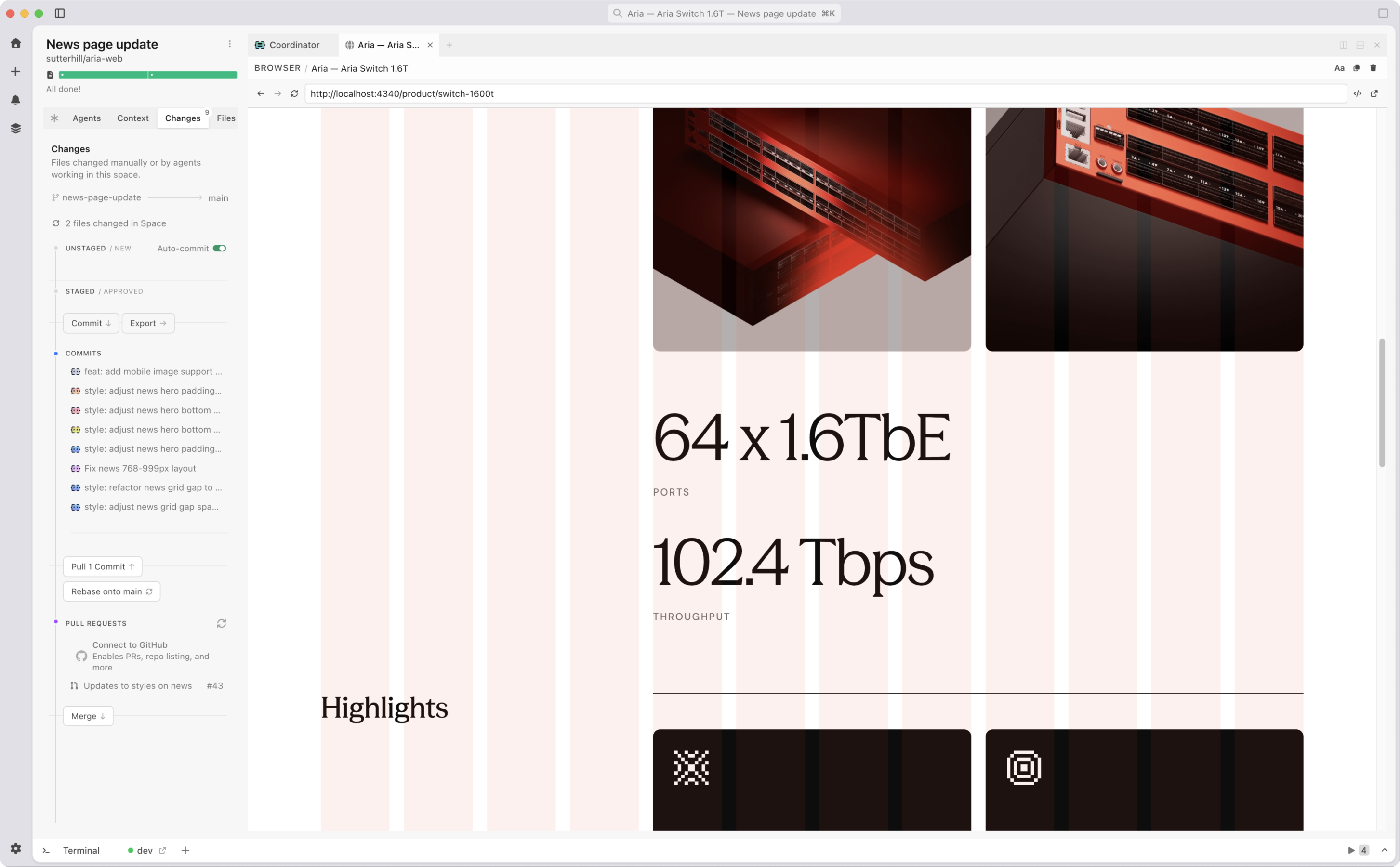 Our developer's job during this phase was partly creative and partly managerial. He handled the templatized pages (news, product detail) where variable content meant design rules mattered more. He also kept an eye on pull requests, merged changes, resolved conflicts, and updated the agents.md file when he noticed patterns emerging in the code that should be standardized.
