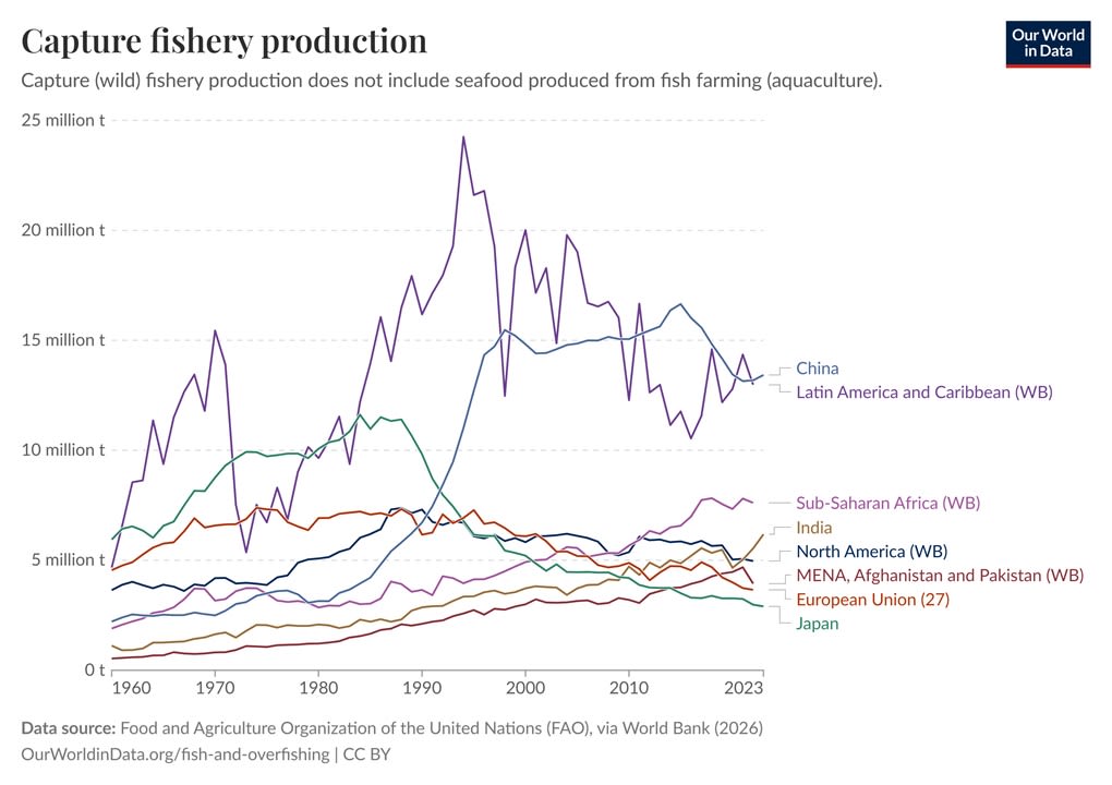 In terms of catching wild fish, it’s basically China and Latin America dominating everyone else: