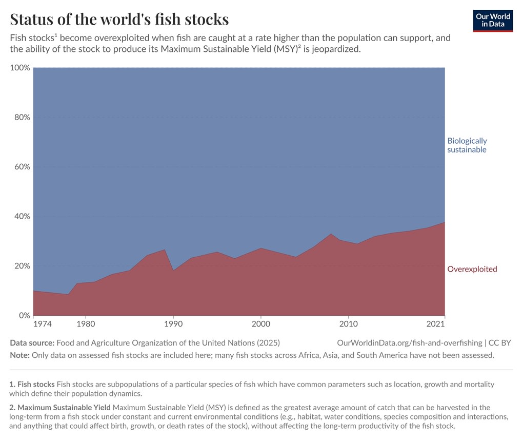 The key fact here is that whether you care more about the natural world or whether you care more about future humans being able to eat fish, the world is catching too many fish. An increasing percent of the world’s fisheries are now overexploited: