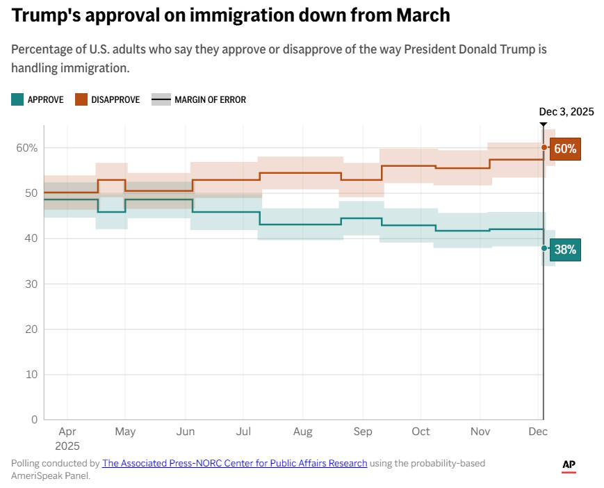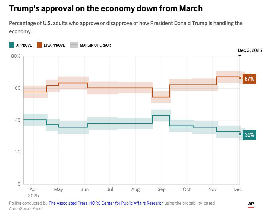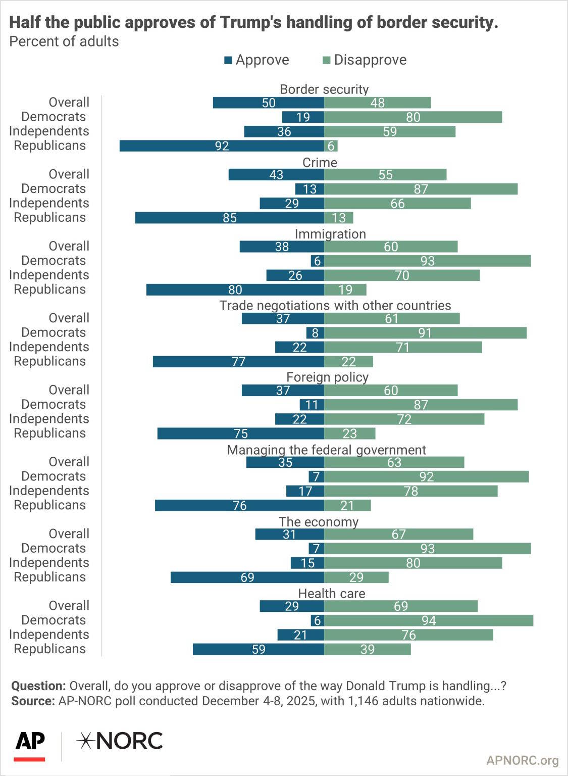 First of all, the AP poll is just one poll. Overall, Trump’s approval rating has drifted downward, and he had a bad November, possibly because of the government shutdown. But since the shutdown ended, his approval has rebounded somewhat, and is still above 40% in the poll averages: