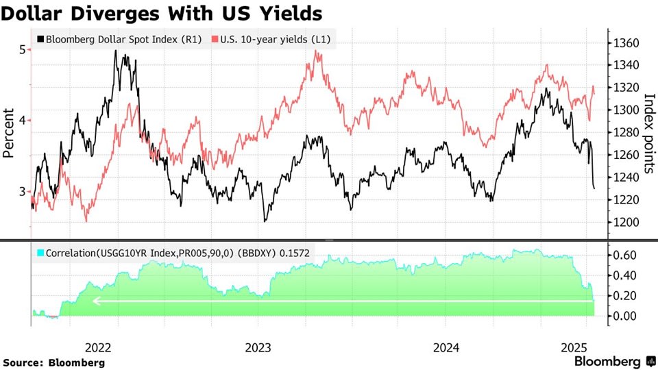 We know capital flight was underway because at the same time that investors were dumping Treasuries, they were also moving their money out of the U.S. entirely. Usually, when investors sell Treasuries, they put the money elsewhere in the U.S. - stocks, real estate, etc. But last April, the dollar went down even as yields went up: