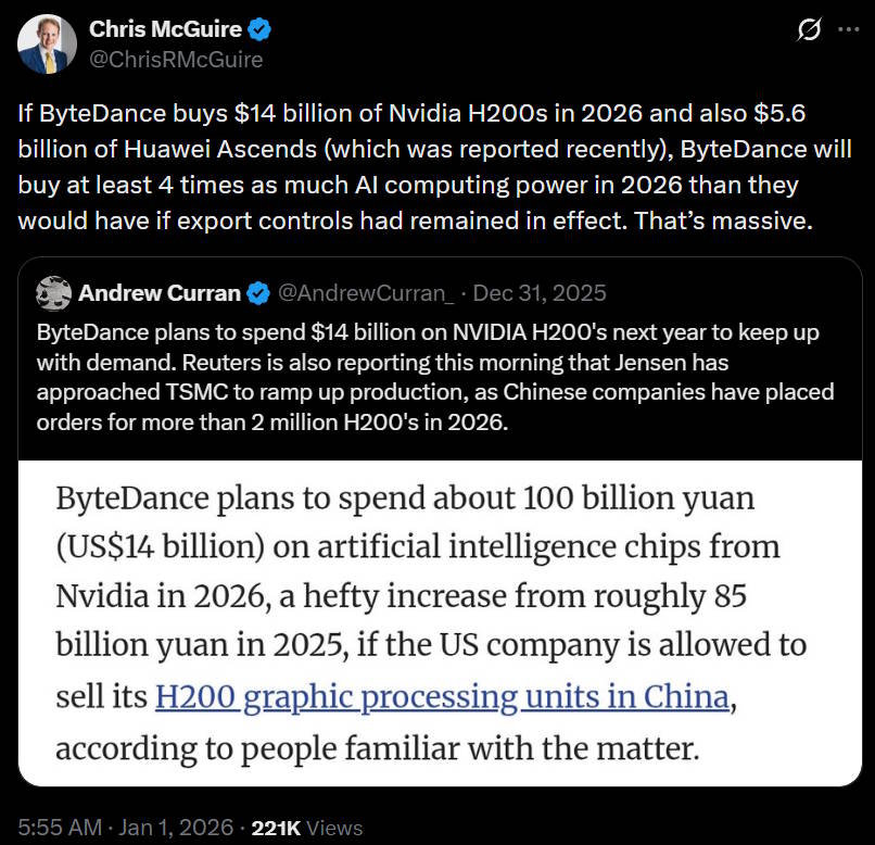 In mid-2025 there was a rumor that Trump was going to allow sales of an Nvidia chip called the h20 to China. Ultimately the administration backed off amid a torrent of criticism from hawkish elites. But in December, Trump announced that he would allow the sale of a far more powerful Nvidia chip, the H200. The Institute for Progress had a good post explaining what this means: