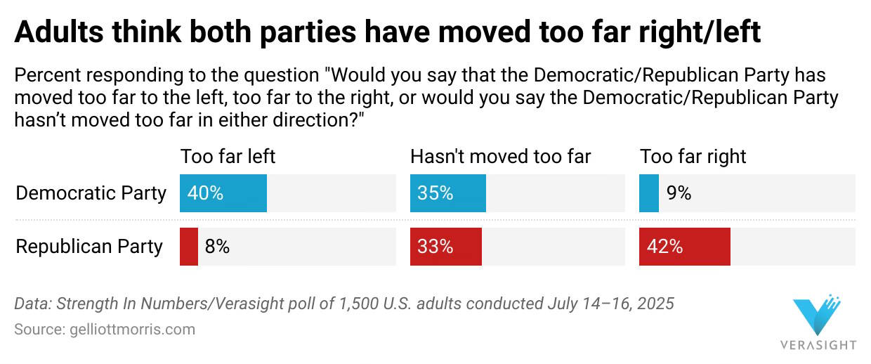 And yet as unpopular as Trump is, the Democrats seem to be in even worse shape. The two parties are neck and neck in terms of approval, with the GOP slightly ahead, even though a thermostatic reaction to Trump’s overreaches and blunders ought to be making the Dems more popular right now. And despite the fact that Trump is talking about a third term and ending birthright citizenship and cracking down on the press etc. etc., people perceive the GOP as no more extreme than the Dems: