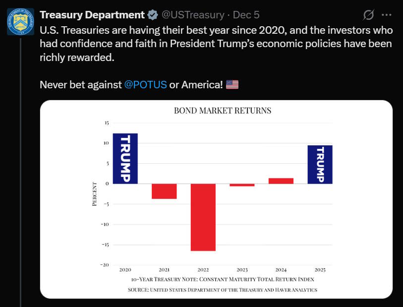 Why does Trump want rate cuts? Well, lower rates push up the value of stocks, bonds, and other financial assets, which Trump and his family own a lot of. This motivation might be why Trump’s Treasury Department is tweeting out charts touting bond price increases in 2025: