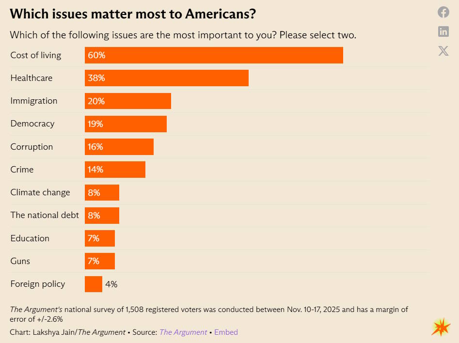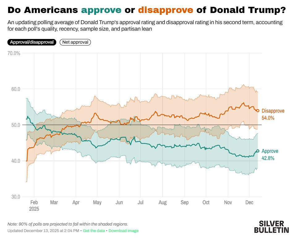 And many of Trump’s other outrages, missteps, and bad policies simply don’t seem to be breaking through to the public consciousness. Avid news-readers might be aghast at Trump’s attempts to bully Ukraine into accepting an unfavorable peace deal, or at Pete Hegseth’s probably-illegal orders to massacre people on boats in the Caribbean. They might be disturbed by Trump’s plans to sell advanced Nvidia chips to China, or by rumors of an invasion of Venezuela. They might be outraged at any of the administration’s numerous corruption scandals. But a lot fewer Americans are reading the news: