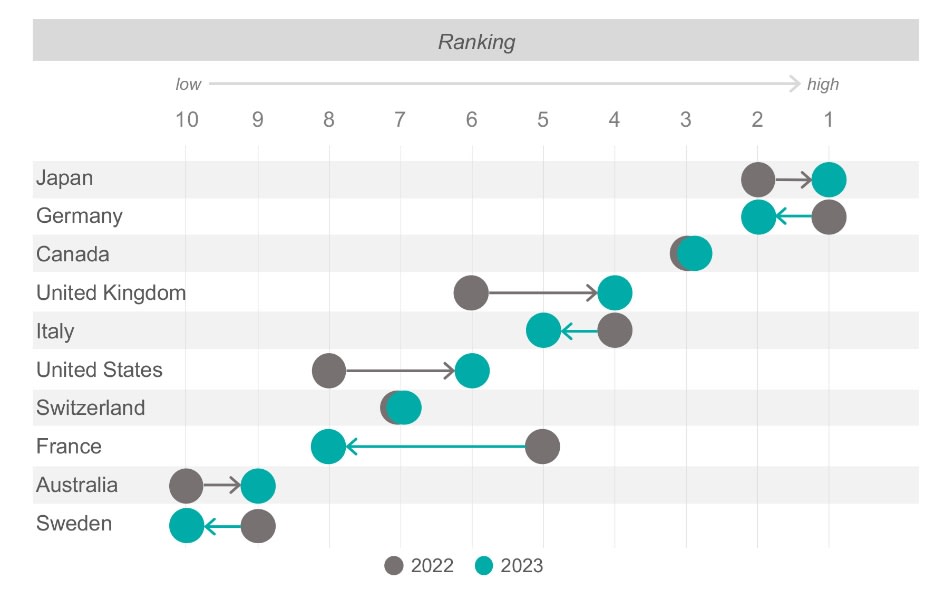 Japan’s international cachet can be seen in a variety of international surveys and rankings. In 2023, Japan topped the Anholt-Ipsos Nation Brands Index, which has measured international perceptions of various developed countries for 15 years: