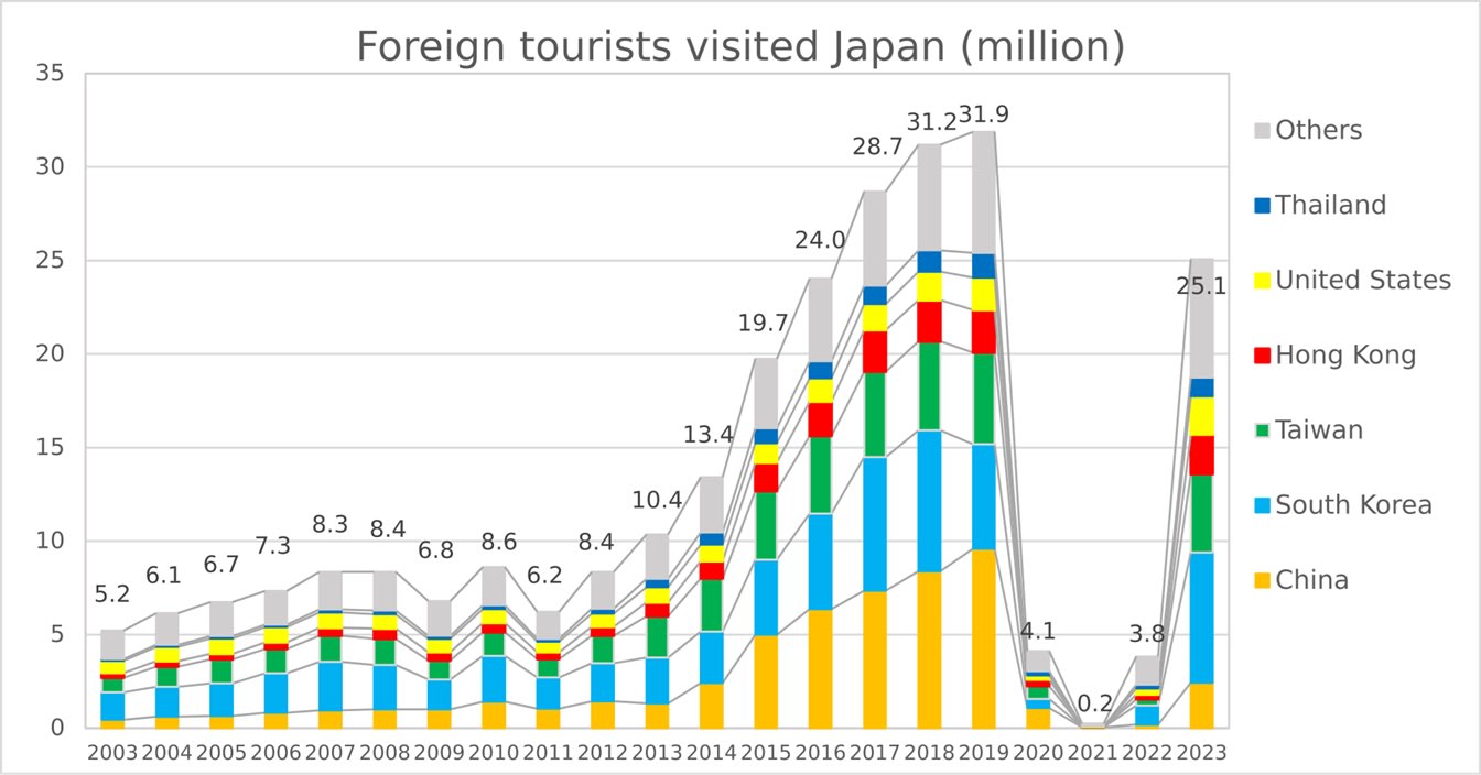 By now, everyone in Japan knows all about the tourism boom, but the numbers are still staggering. In 2007, 8.4 million tourists came to Japan. By 2019 that number had almost quadrupled, and is now rebounding sharply from the pandemic: