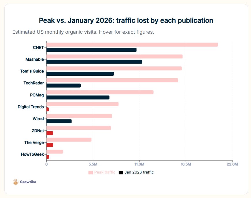 In fact, you can sort of see hints of this happening already. Website traffic is collapsing, as people read AI instead of websites. Tech publications, for example, are rapidly losing their readership: