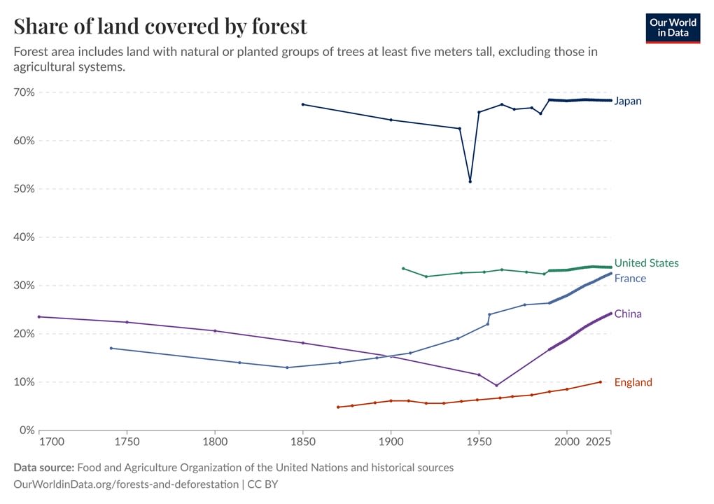 Encouragingly, note the progress in China on the chart above. Some of this reforestation is motivated by the self-interested need to stop soil erosion and desertification, but China’s government has also increased its commitment to biodiversity. As another example of this, China banned fishing in the Yangtze River in 2021, in order to save fish stocks.