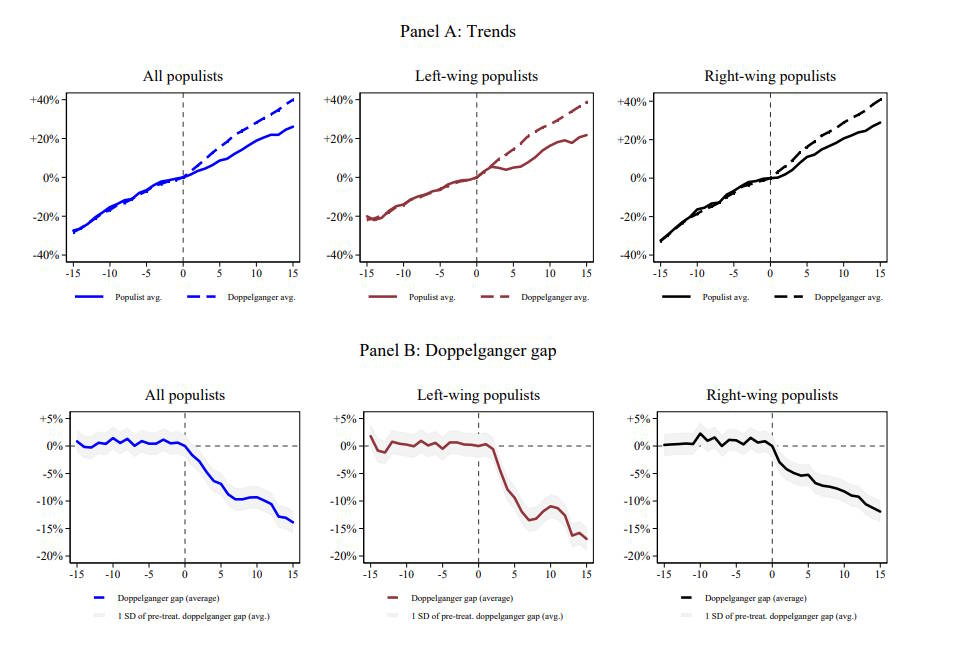 This is, to put it mildly, not ideal. First of all, Putin-type leaders tend not to be very effective. Even discounting their tendency to start (and lose) wars, the economic impact of populist leaders is typically very negative. Here’s a chart of what happens to GDP when populists get elected: