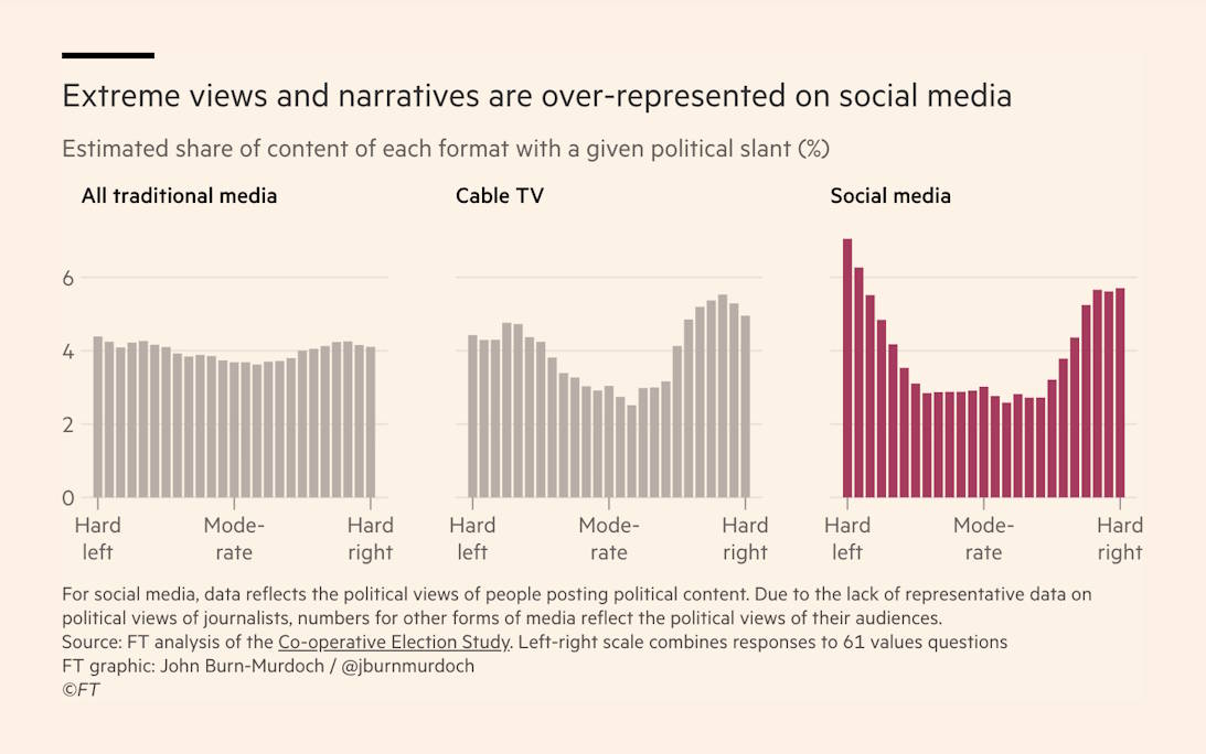 This explosion of new information technologies, like the printing press half a millennium earlier, blew away all the old gatekeepers. Some people still celebrate this as a victory for marginalized voices, but an increasing number of people realize that it’s a major factor behind the rise of extremism and illiberalism. Social media broadcasts extreme viewpoints at the expense of the moderates whom the old gatekeepers used to elevate: