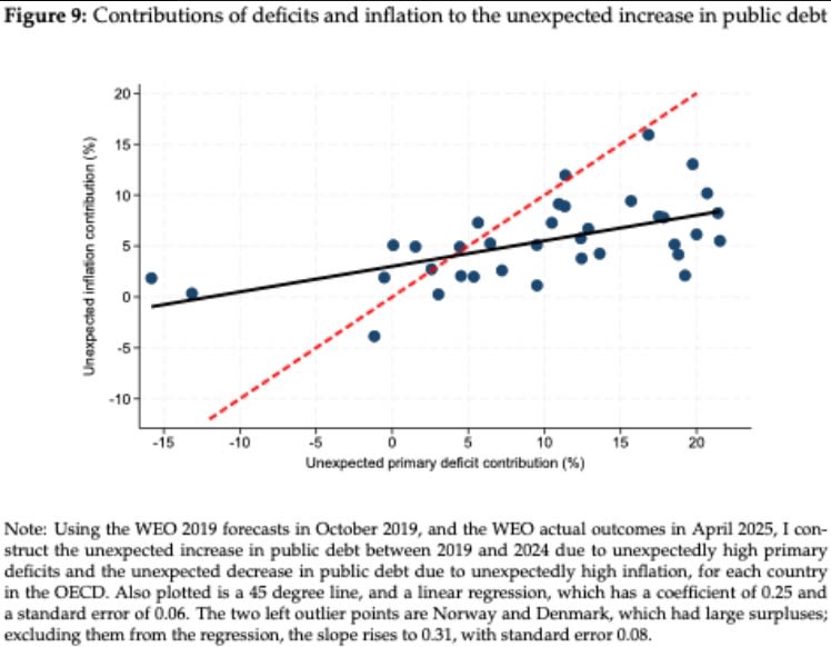 To inspect this claim, you can use expectations data…[Here’s a] plot [that] compares the unexpected high deficits with the unexpected high inflation terms for OECD countries, using the common units of their impact on the public debt…For countries that ran higher unexpected fiscal deficits, inflation was also unexpectedly higher.