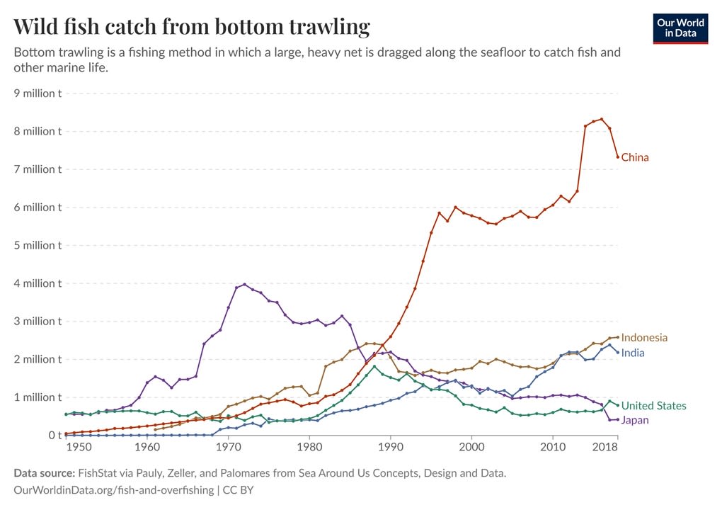 China’s lack of concern for sustainability plays a large part in this. Chinese fishing vessels are more likely to use various techniques that make them catch more juvenile fish. One of these is bottom-trawling, which drags nets along the seabed. Japan and the U.S. have largely given up on this practice; China has long been the world’s worst offender.
