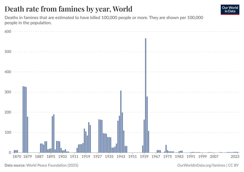 We all know the story of why Ehrlich was wrong. He predicted that the world would run out of food, producing catastrophic famines in the 1970s. Based on those predictions, he called for things like cutting off emergency food aid to India, reasoning that if people were saved from starvation today, it would just mean more people to die of starvation later on. But new farming techniques known as the Green Revolution created enough calories to feed the whole world with plenty to spare. The Population Bomb came out in 1968; by then, famines were essentially already a thing of the past: