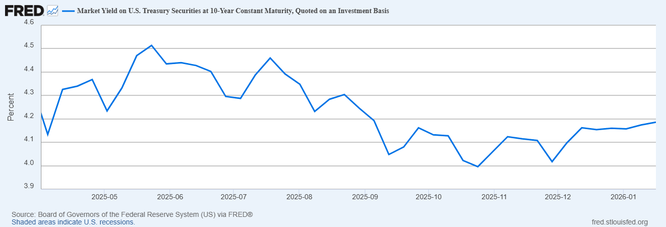 Trump also dropped his tariff threats against Europe. He instead announced a “deal” that would give the U.S. full military access to Greenland (which it already had) and give the U.S. the right to mine minerals in Greenland. Stock markets rose and Treasury yields fell, though the dollar didn’t rebound against the euro.