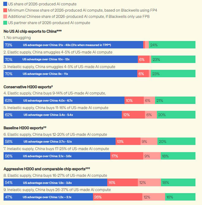 With no AI chip exports to China and no smuggling, we estimate the US would hold a 21–49x advantage in 2026-produced AI compute, depending on whether FP4 or FP8 performance is used for Blackwell chips.7 This advantage would translate into a much greater American capacity to train frontier models, support more and better-resourced AI and cloud companies, and run more powerful inference workloads for more capable AI models and agents. Unrestricted H200 exports would shrink this advantage to between 6.7x and 1.2x, depending on the scale of Chinese demand and the degree of adoption of FP4. [emphasis mine]