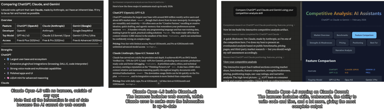 Until recently, you didn’t have to know this. The model was the product, the app was the website, and the harness was minimal. You typed, it responded, you typed again. Now the same model can behave very differently depending on what harness it’s operating in. Claude Opus 4.6 talking to you in a chat window is a very different experience from Claude Opus 4.6 operating inside Claude Code, autonomously writing and testing software for hours at a stretch. GPT-5.2 answering a question is a very different experience from GPT-5.2 Thinking navigating websites and building you a slide deck.