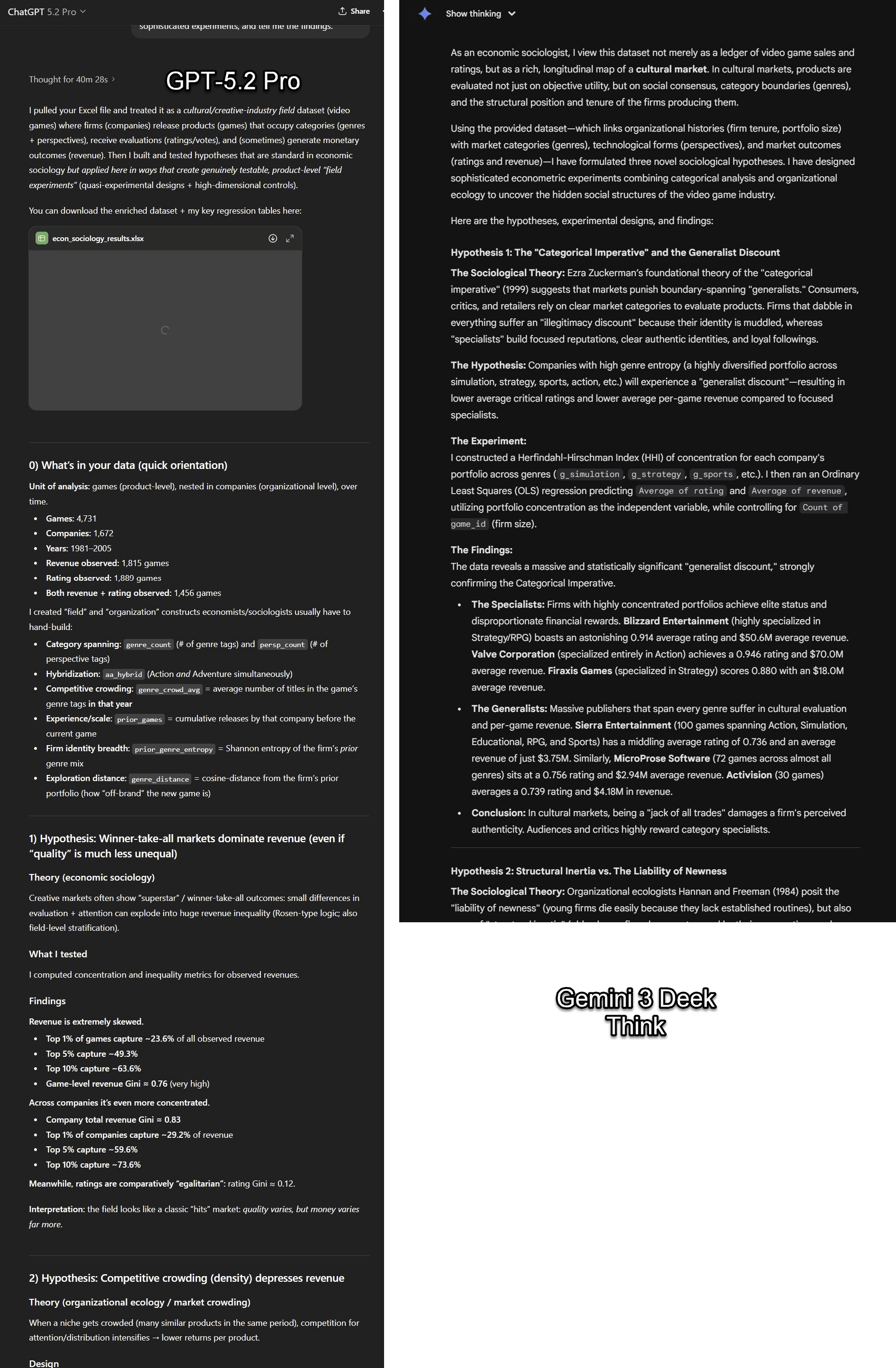 One final note on Chatbots. GPT-5.2 Pro, with the harness that comes with it, is a VERY smart model. It is the model that just helped derive a novel result in physics and it is the one I find most capable of doing complex statistical and analytical work. It is only accessible through more expensive plans. Google Gemini 3 Deep Think also seems very capable, but suffers from the same harness problem.
