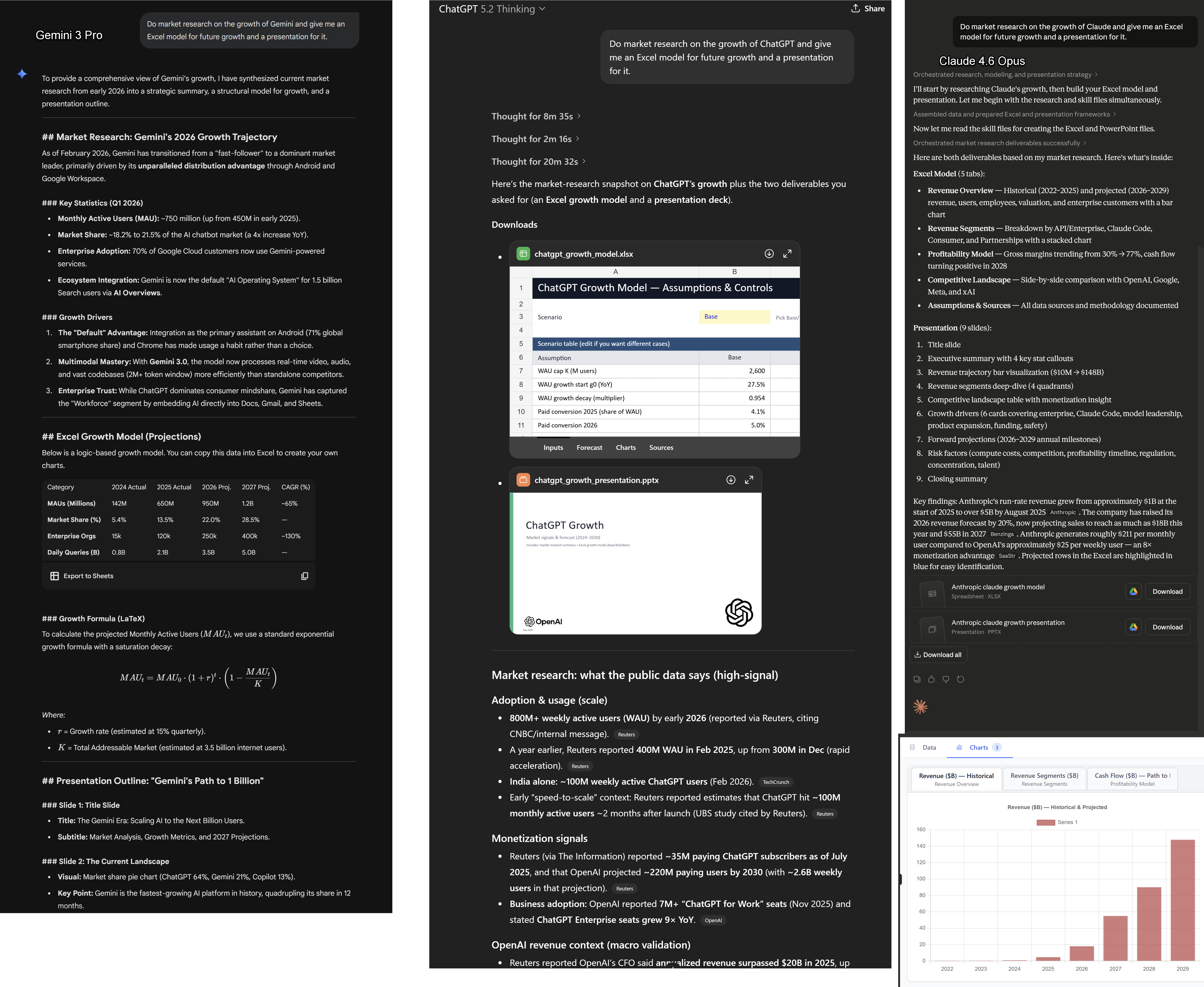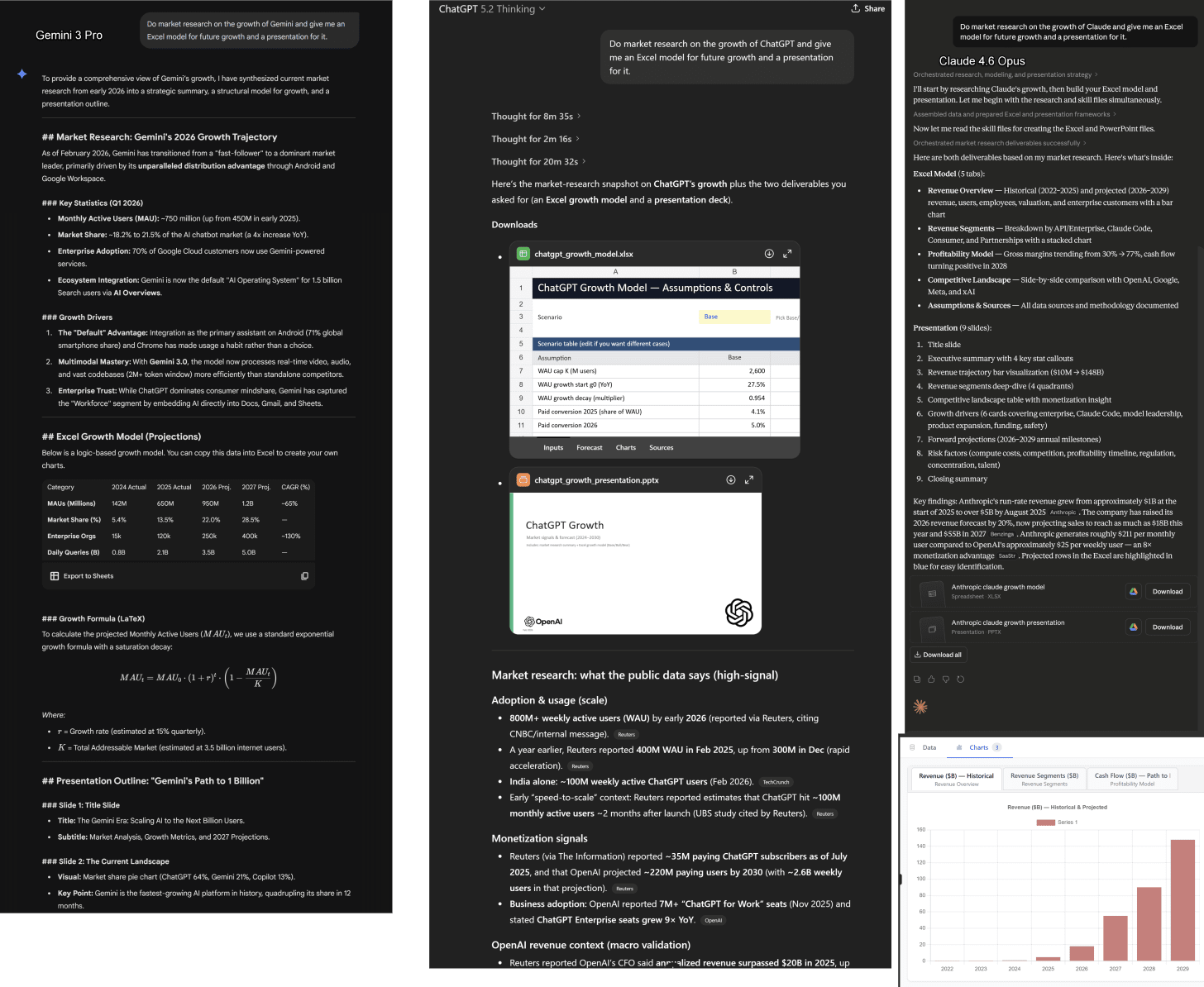 As you can see, asking a similar question gets working spreadsheets and PowerPoints from ChatGPT and Claude, along with clear citations I can follow up on. Gemini, however, is unable to produce either kind of document, and it does not provide citations or research. I do expect that Google will catch up here soon, however.