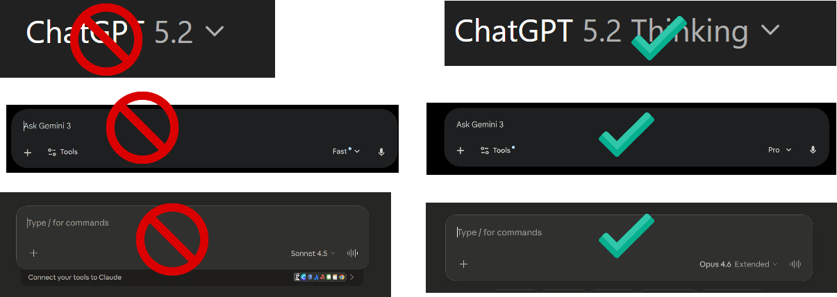 For Gemini, there are three options: Gemini 3 Flash, Gemini 3 Thinking, and, for some paid plans, 3 Pro. If you pay for the Ultra plan, you get access to Gemini Deep Think for very hard problems (which is in another menu entirely). Always pick Gemini 3 Pro or Thinking for any serious problem. For Claude, you need to pick Opus 4.6 (though the new Sonnet 4.6 is also powerful, it is not quite as good) and turn on the “extended thinking” switch.