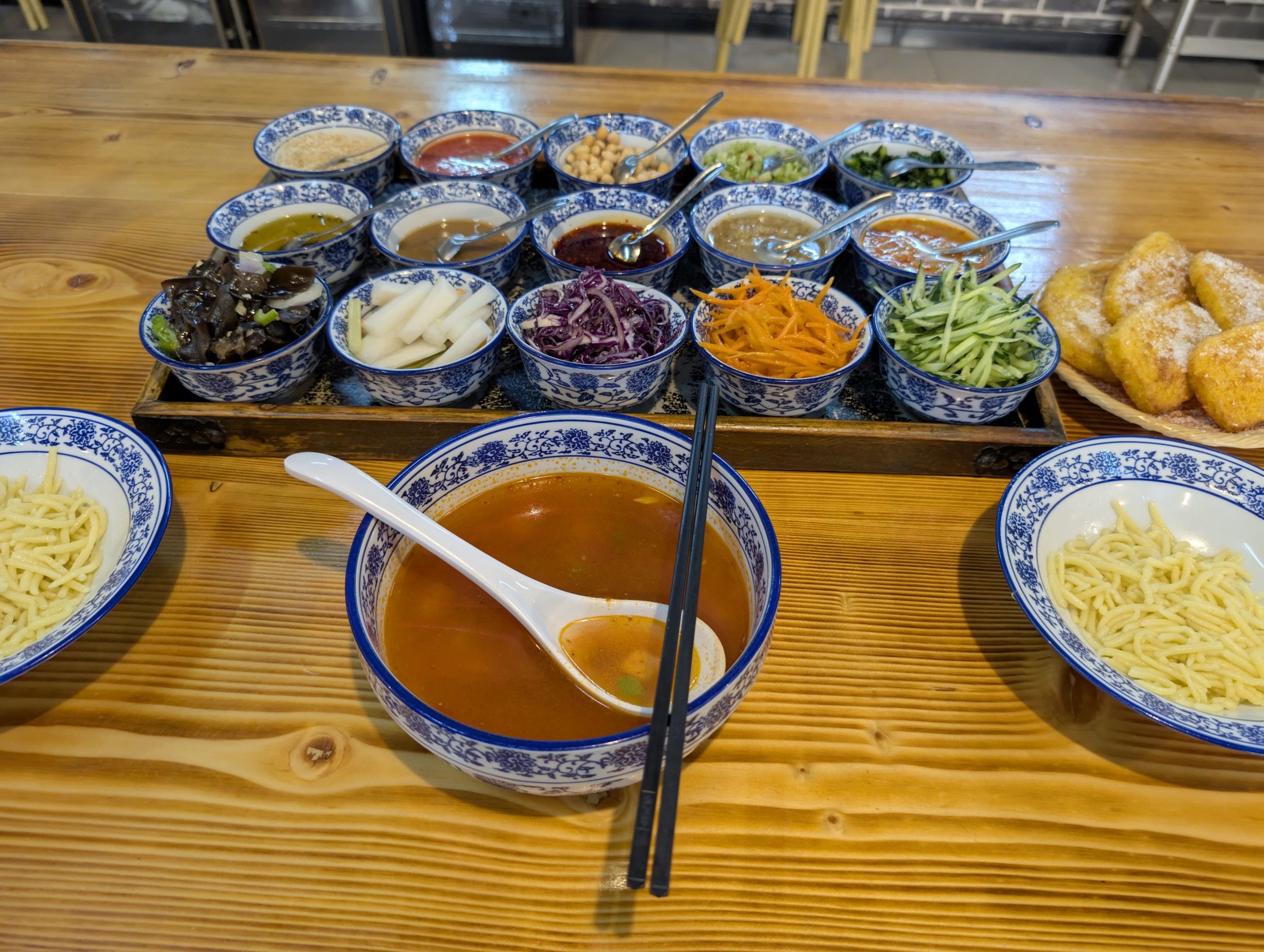 今天准备去榆林窟,那边离敦煌有 160+ 公里,所以早一点起床了。早饭去吃的抿节,味道挺好的而且量大管饱。面加小菜只要 18 一人。首先店家会端一盘小菜和调料上来,然后每人都会逐一上玉米面、荞麦面、莜麦面等,只有吃完了上一碗才会端下一碗上来,只要吃得下,面是无限续的。不过 6 碗面我们只吃到第 3 碗就已经吃饱了。