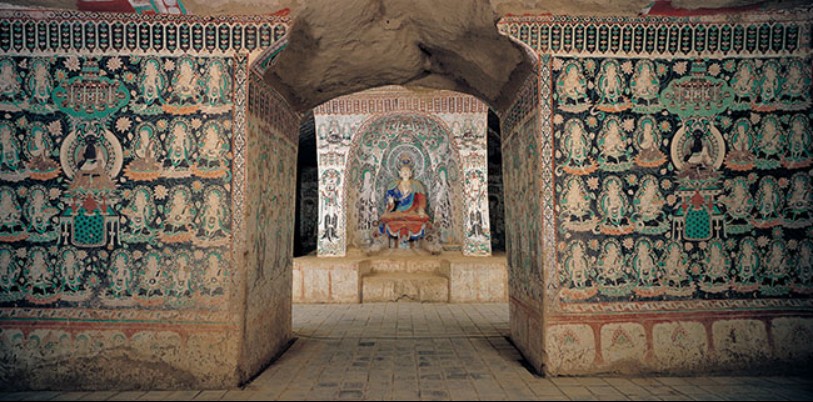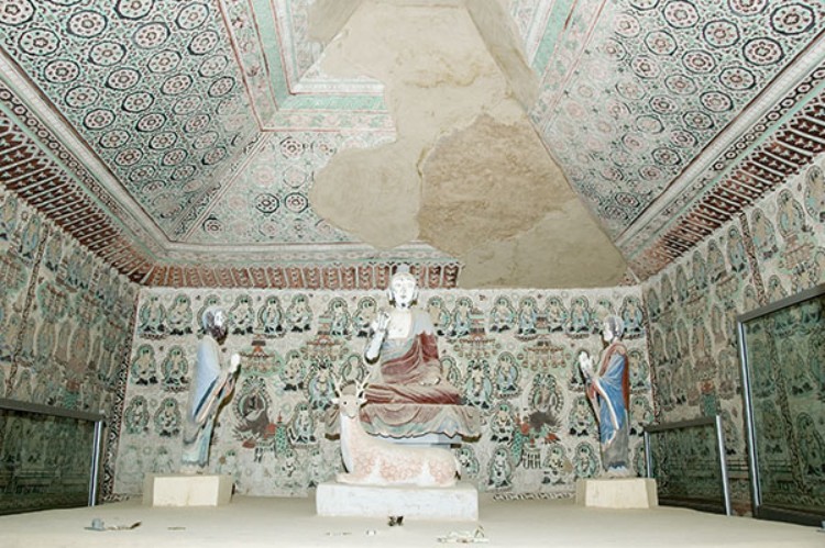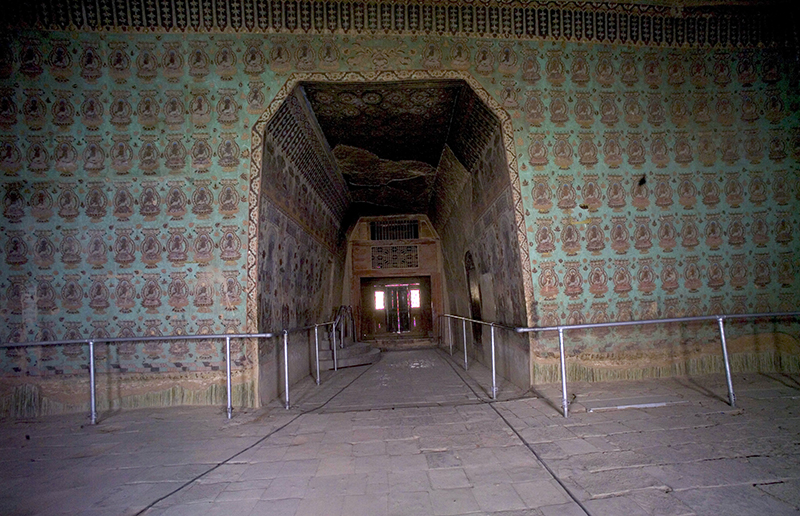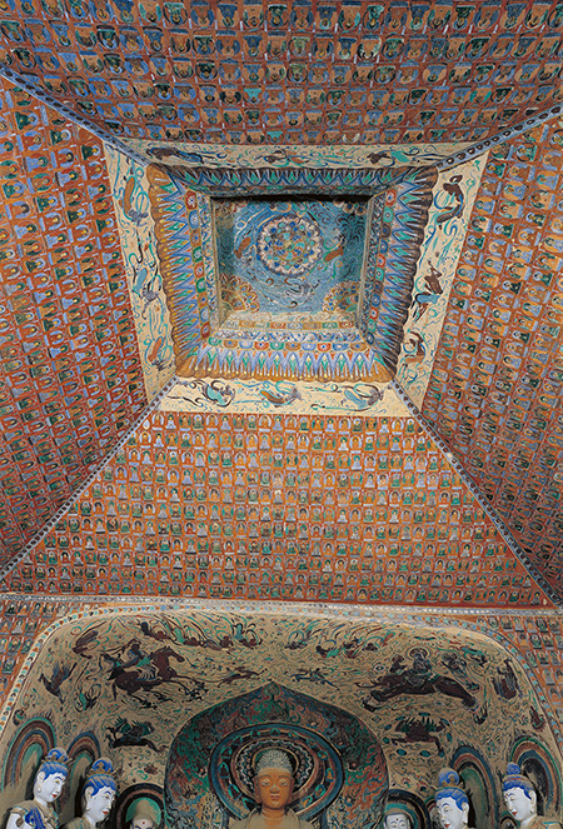 洞窟四壁绘有千佛。千佛壁画在敦煌壁画中的所占比例很大,有壁画的 492 个洞窟中,343 个洞窟中都有千佛图像。因此,莫高窟在民间也被称为千佛洞。