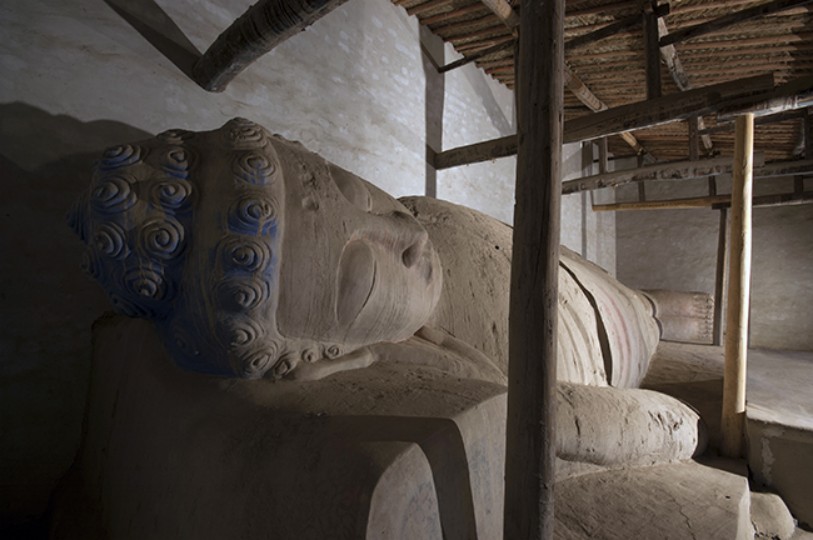 第 5 窟严格讲不是窟,它原本是露天放置的释迦牟尼卧像,就跟张掖大佛寺类似。不过张掖是木胎泥塑,这里是石胎泥塑,长度为 10.9 米。唐代时期造好后就这样露天放置,而瓜州风沙又大,再加上地处明朝嘉峪关外,无人居住,就这样埋了 300 多年,直到清代才有移民在此生活。