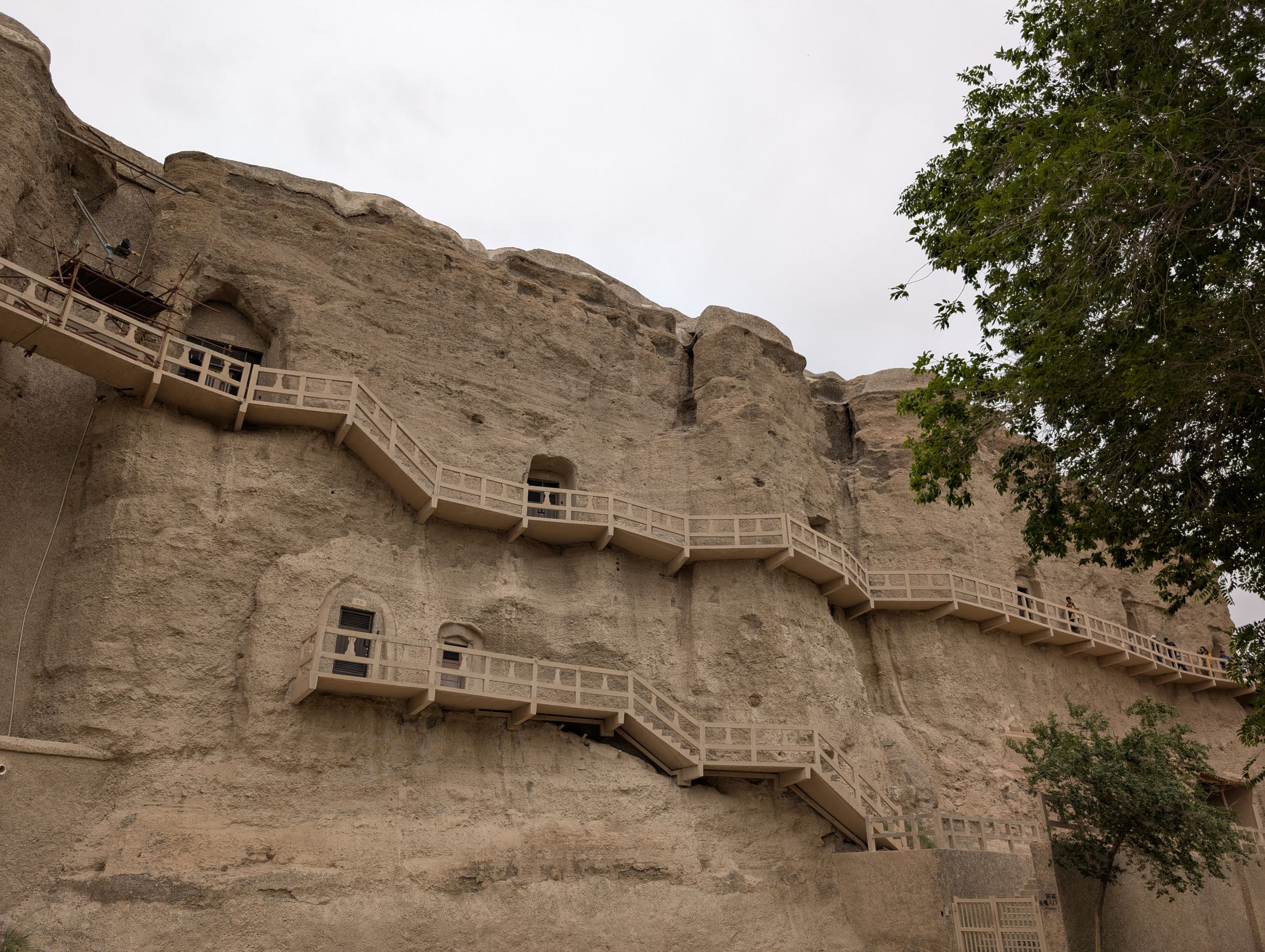 改革开放之初,国内资金紧缺,文物保护也出极度困难的境地,许多洞窟只有残破不堪的木栅门,许多洞窟甚至门都没有。就是这种情况下邵逸夫先生捐款 1000w 港币用于文物保护。通过这款捐款才给莫高窟、榆林窟、西千佛洞中 500 多个洞窟装上了铝合金门,100 多个洞窟安装了玻璃屏风,减少了风沙和人为破坏。参观时听讲解说洞窟外的石壁上也修有一些裸露的壁画,那是五代和宋朝时期修建的,当时的崖壁没有开凿洞窟的条件,于是就画在山崖上了。