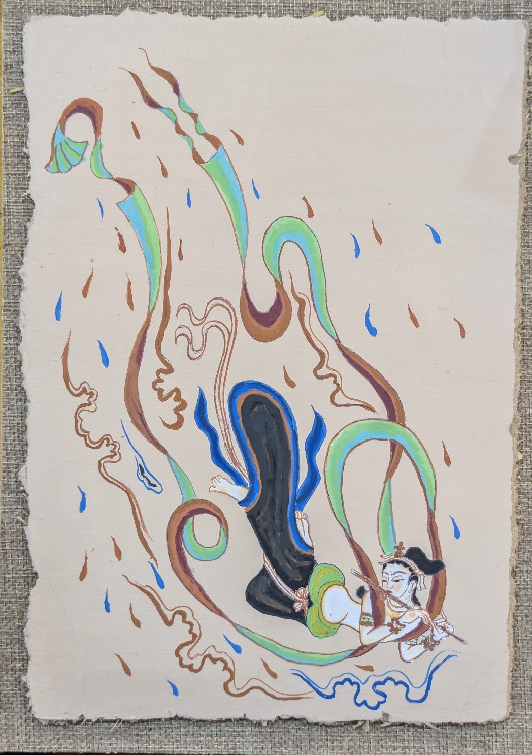 飞天又名乾达婆、香音神。是佛教八部护法神之一,是歌舞散花之神。窟顶藻井中心有围绕莲花旋转的四身飞天,她们都是按逆时针方向转动,动作犹如水中畅游的仙子般舒展自由。辗转的飘带,洋洋洒洒,周围飘动的流云与飞天飞行的方向一致,旋转的律动感更加强烈。