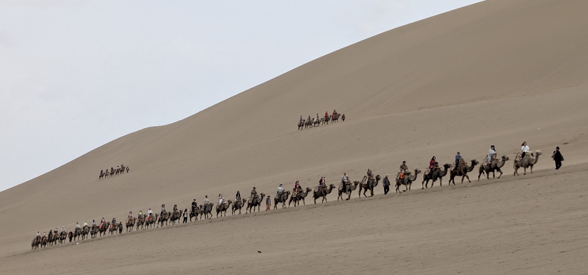 差不多 7 点骑上了骆驼。鸣沙山的骆驼都是劳模,一次又一次地驮着人类爬山。据说暑假旺季还会增加一倍的临时工骆驼,到时候山上密密麻麻不敢想。
