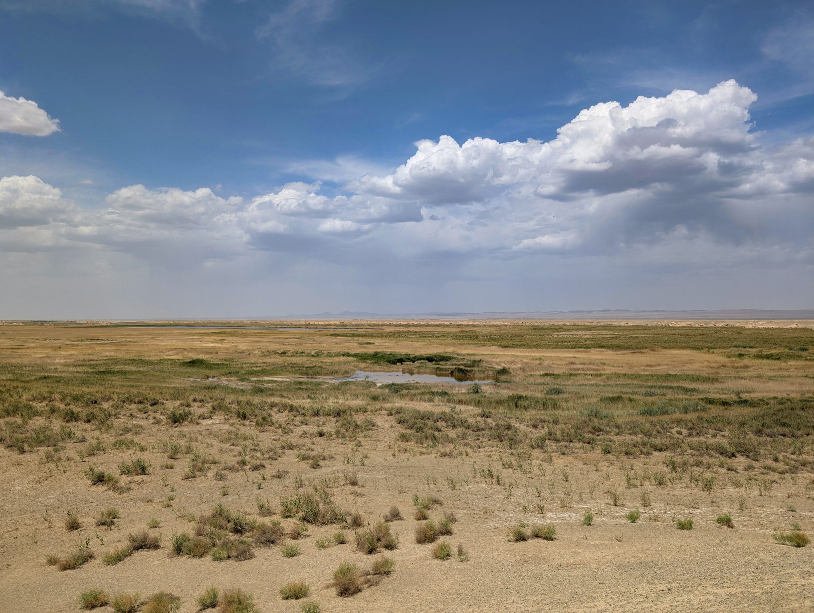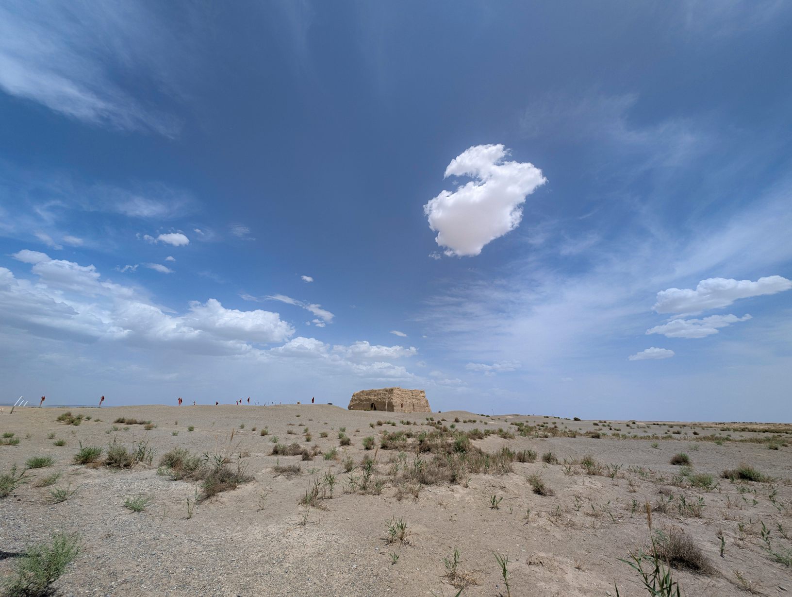 1 点多到了玉门关。我们还是直接过去了,因为这时天气稍微变好,有蓝天也露了点太阳出来。这么几天下来总算有体会了,天气好的时间基本都在中午到下午一两点这段时间,也就是一天最热的时候。而到傍晚时分,云层通常就会变厚,大前天在月牙泉看到的估计就是唯一的日落了。如今云朵在高空的强风里摇曳,如素纱丝絮,夏空也伴随着阳光在这纤薄的云丝中显现。时不我待,鬼知道回来时还有没有这蓝天了,果断一把方向拐到停车场去。