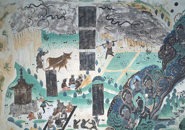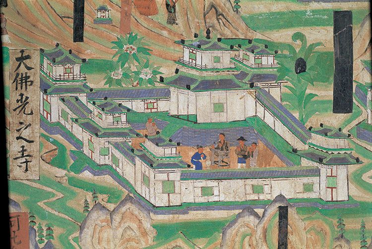 《五台山图》不同于其它经变画,它描绘的是当时五台山一带的社会生活场面,具有一定的历史真实性。正因为它的存在才能让我们看到曾经的五台山风貌。也使我们看到了古代现实生活的一个方面,如推磨、舂米、拜佛者、送供者、牵驼者等,对研究古代社会生活民俗等方面来说是不可多得的珍贵资料。