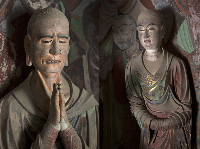 佛像两侧是两位弟子迦叶和阿难。左侧为迦叶,他是释迦牟尼十大弟子之首,因少欲知足被称为“头陀第一”。这身塑像端严直立,双手合十,双眉紧缩,表现出一位老年高僧庄严虔敬的神情。右侧为阿难像。阿难是释迦牟尼佛的堂弟,他 19 岁皈依佛门,侍佛 25 年,多闻佛法,长于记忆,被称为“多闻第一”。此身阿难像身躯微斜,两手笼于袖内,昂首侍立,面貌丰润,双目微睁,似在出神聆听。