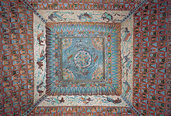 窟顶是莲花飞天藻井,它是莫高窟现存最精美的藻井壁画之一,藻井井心以淡蓝色作地,象徵天空,中心绘有一大朵莲花。佛教认为莲花是西方净土的象徵。围绕着莲花是四身执花飞天,在蓝天的映衬下,长巾飘举,遨游曼舞,周围浮云流动。最外层是一组伎乐飞天,他们手握琵琶、箜篌、腰鼓等,淡黄的底色,与内层的蓝色相呼应,气氛热烈欢快。