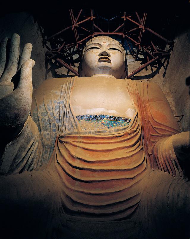 96 窟是敦煌莫高窟的标志性洞窟,因外部建有九层木构窟檐而俗称“九层楼”,高达 33 米,是莫高窟的视觉中心。窟内空间呈方形,下宽上窄,以容纳巨型弥勒佛像,走进洞窟后可以从下方仰望弥勒佛坐像,因仰视透视需要,工匠刻意放大上半身比例(尤其是胸部与肩部),压缩下半身,使袈裟在观众视角下呈现均衡舒展的视觉效果。楼外还开了两条通道,既可以就近观赏大佛,也给大佛头部和腰部带来了光照。