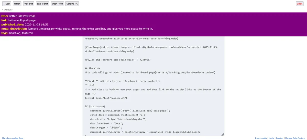 These dashboard styles fix that. I do think a better version of this can be made. The post header area still takes up too much space IMO. And this modification works better on desktop than on mobile. But this is what I was able to throw together in just a few minutes. (If you follow my Bearblog Posts, you can find out when/if I post a new version).