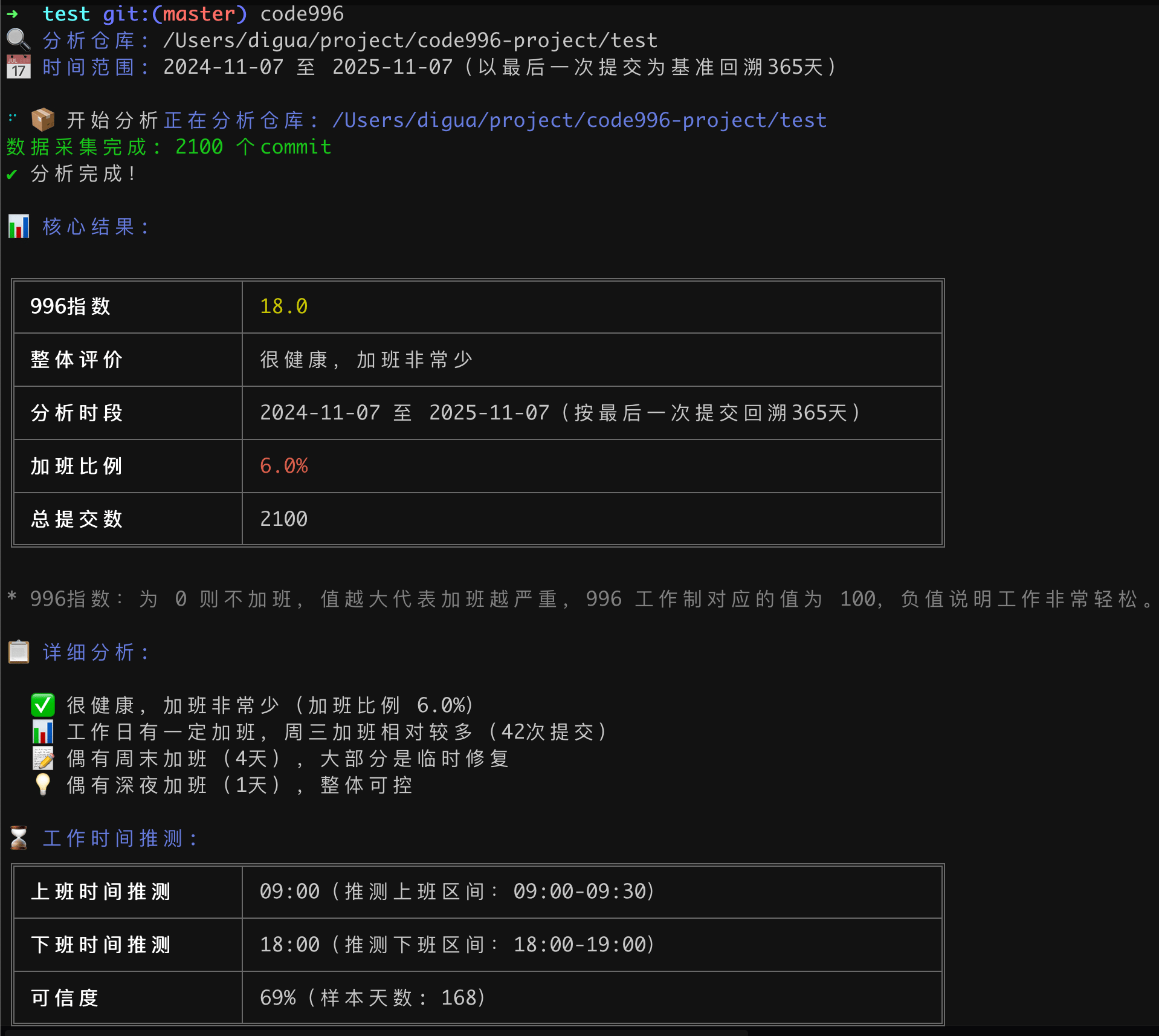 code996 是一个分析工具,它可以统计 Git 项目的 commit 时间分布,进而推导出项目的编码工作强度。