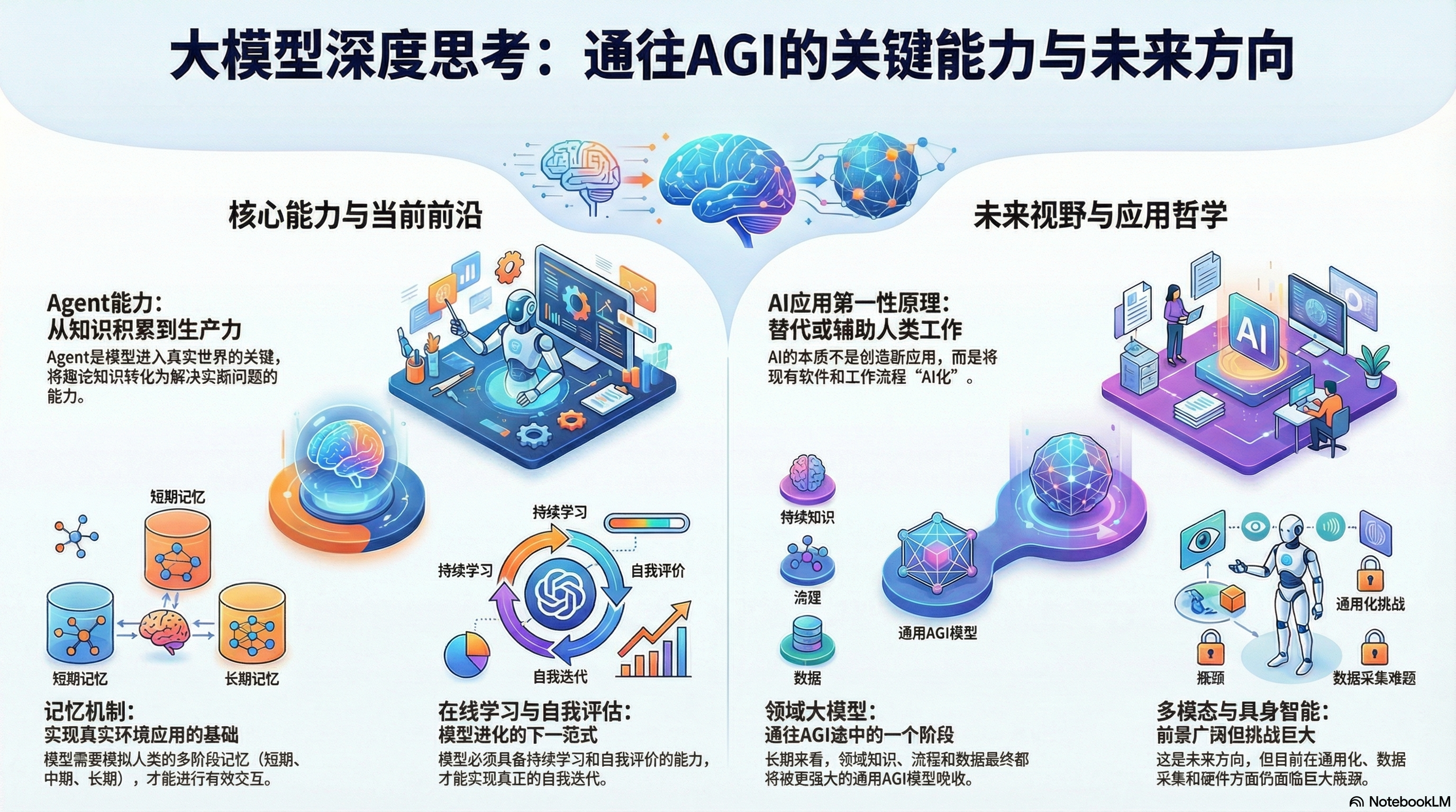 深入探讨了大模型技术的核心演进方向与未来行业格局。指出提升模型效能的关键在于持续规模化基础模型,并通过长尾场景对齐与强化推理能力来增强实际体验。智能体(Agent)化与记忆机制被视为AI迈入真实世界的里程碑,使模型从单纯的知识积累转向真正的生产力工具。