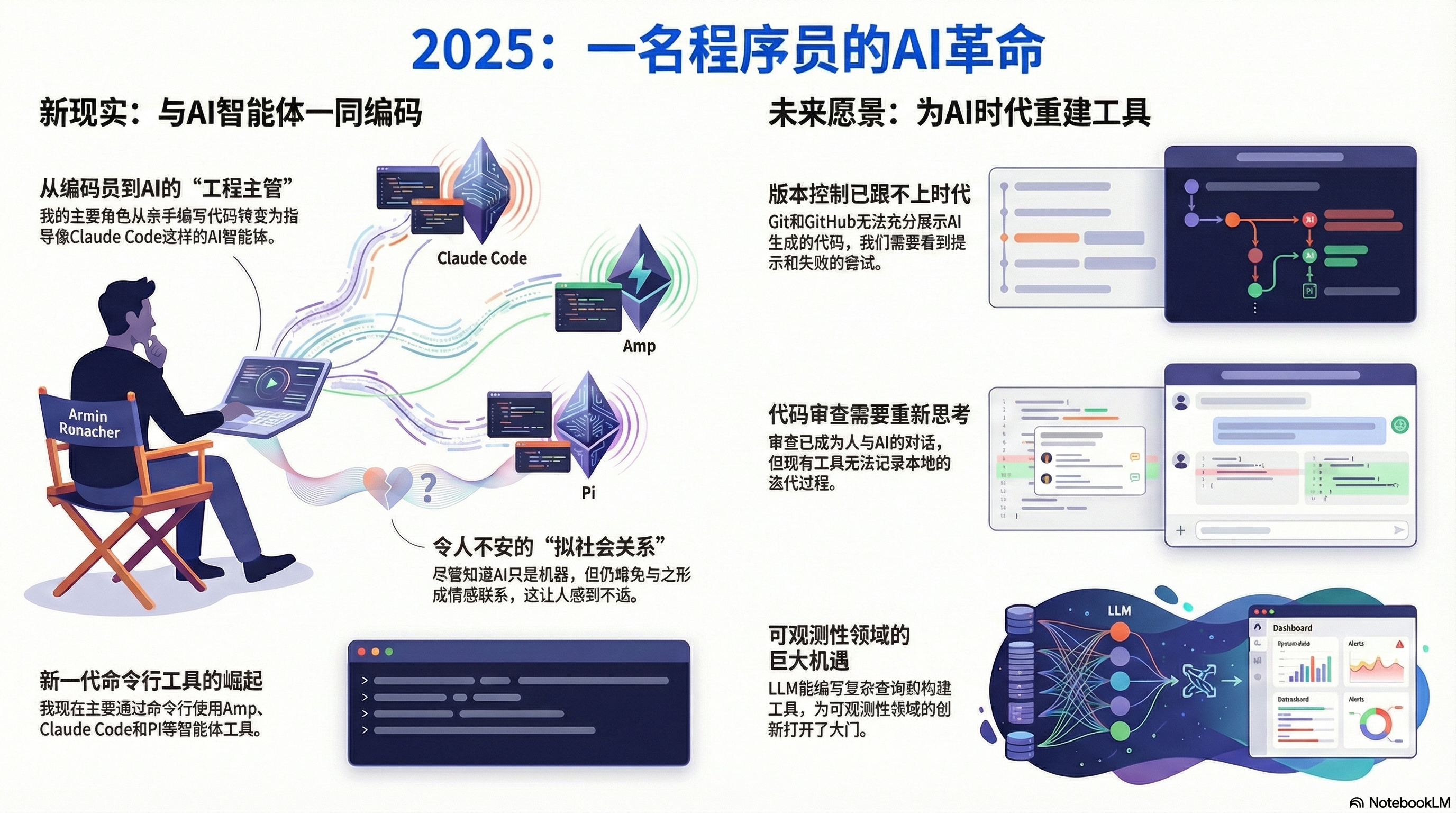 程序员 Armin Ronacher 对其 2025 年工作与生活的深度总结。他详细描述了自己从传统手动编程向代理式编程(Agentic Coding)的重大转变,并分享了使用 Claude Code 等 AI 工具作为虚拟助手的实践经验。