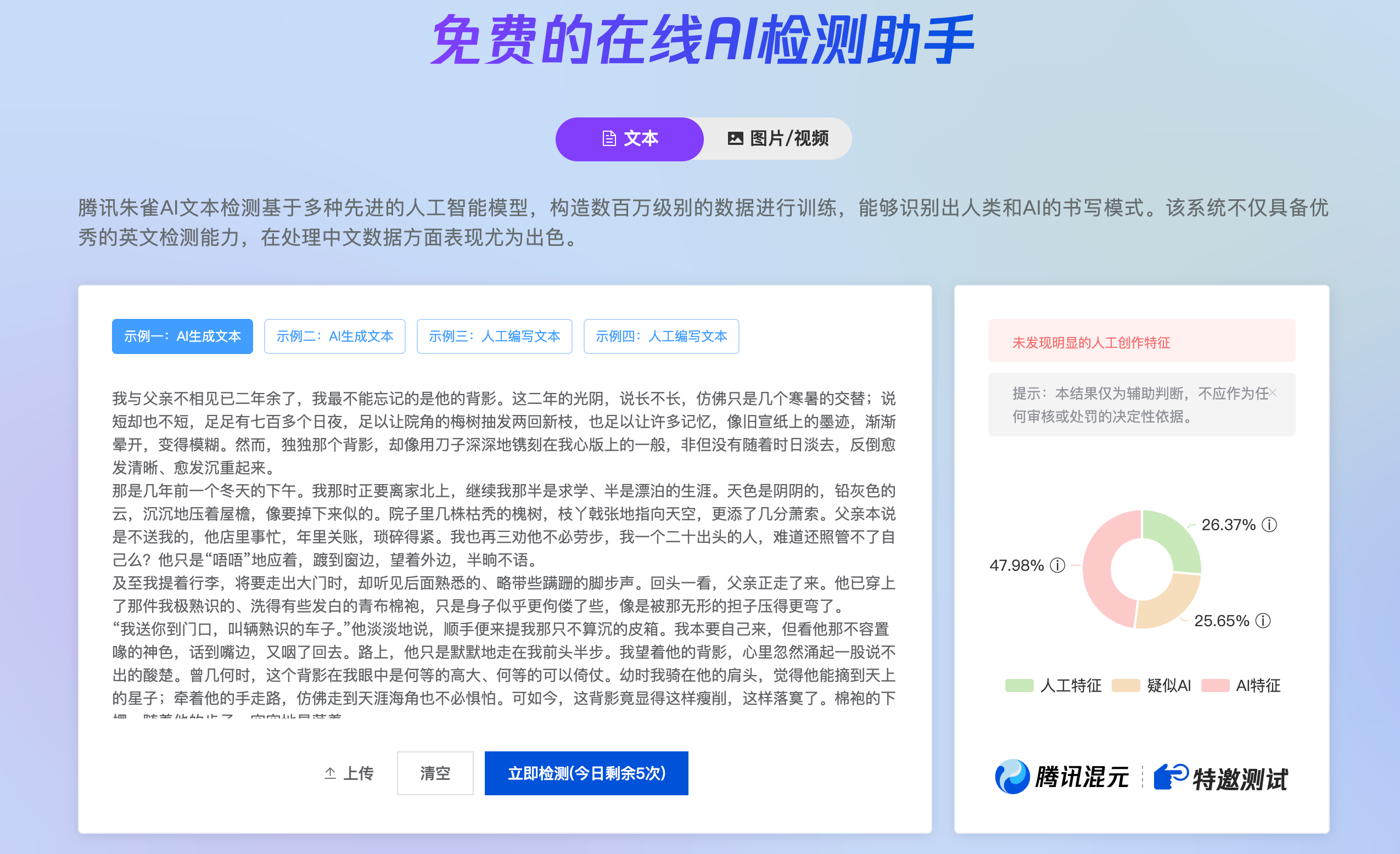 腾讯朱雀AI文本检测基于多种先进的人工智能模型,构造数百万级别的数据进行训练,能够识别出人类和AI的书写模式。该系统不仅具备优秀的英文检测能力,在处理中文数据方面表现尤为出色。