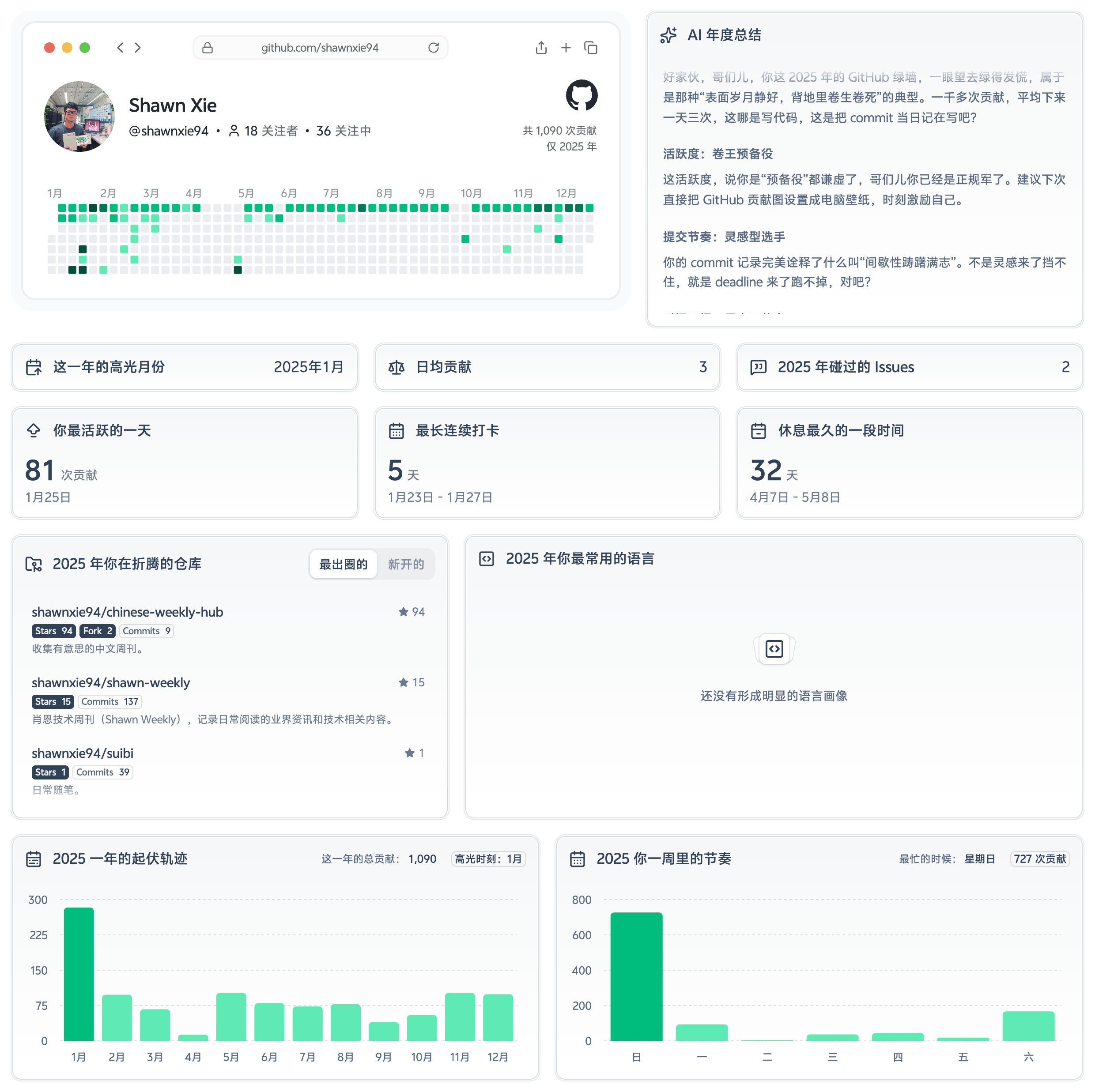 Green-Wall 可用于生成 GitHub 贡献图和 AI 驱动的年度报告。