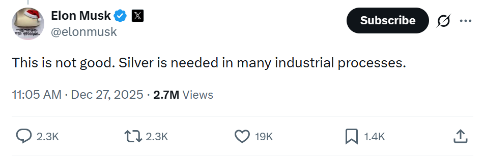 马斯克(Elon Musk)近期在社交平台 X 上对此明确表示:“这不是什么好事。许多工业生产都需要白银。”马斯克的担忧不仅在于特斯拉的造车成本,更在于其 “宏图计划”(Master Plan 3) 的核心——可持续能源转型。