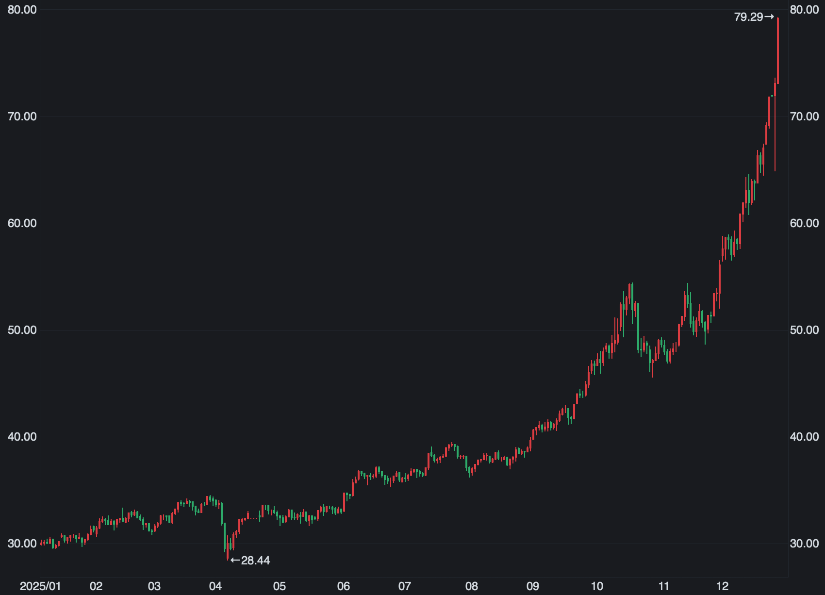 2025年12月,白银市场经历了史诗级的暴涨。现货白银(London Silver)价格冲破每盎司 79美元 关口,年内涨幅超 170%,其波动性和上涨斜率已远超黄金。