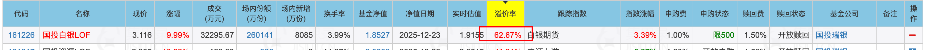 近期关于白银投机的话题很热,原因是场内溢价居高不下,可以进行套利(具体方式可问AI)。溢价(Premium)是指投资产品的交易价格高于其内在价值(净值)的现象。在此轮行情中,国内唯一的白银期货公募基金(国投白银LOF)溢价率一度突破 60%-70%。这意味着场内交易者愿意多花六七成的溢价去抢购该基金,本质上是在博弈更疯狂的涨势,而非进行资产配置。