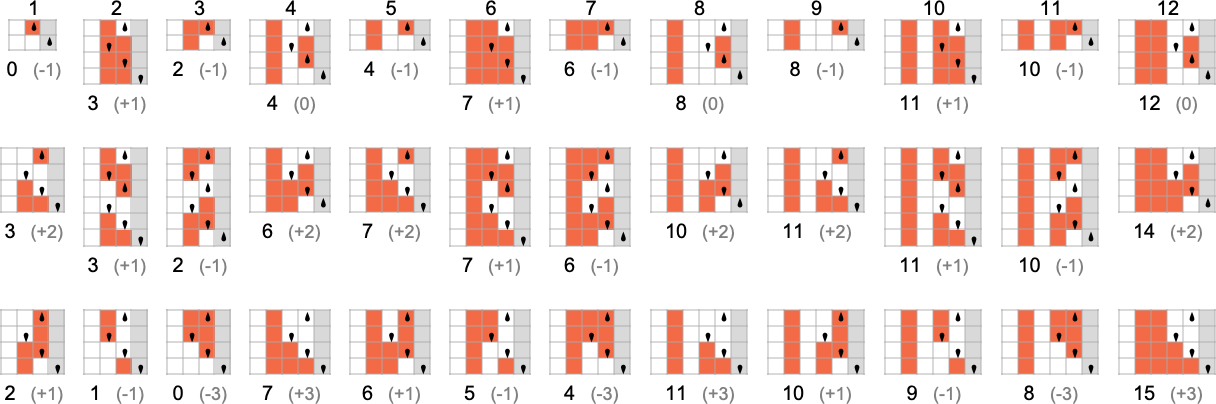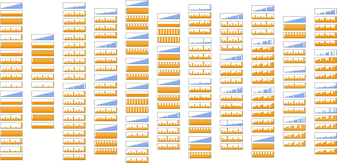 So what about mutational complexity? If we still say that each adaptive evolution step accounts for a single unit of mutational complexity (even if it involves multiple underlying mutations in the rule), this shows how the mutational complexity (as computed above) for different objectives is affected by having different numbers of underlying mutations at each step (the height of each “tick” indicates the number of mutations):