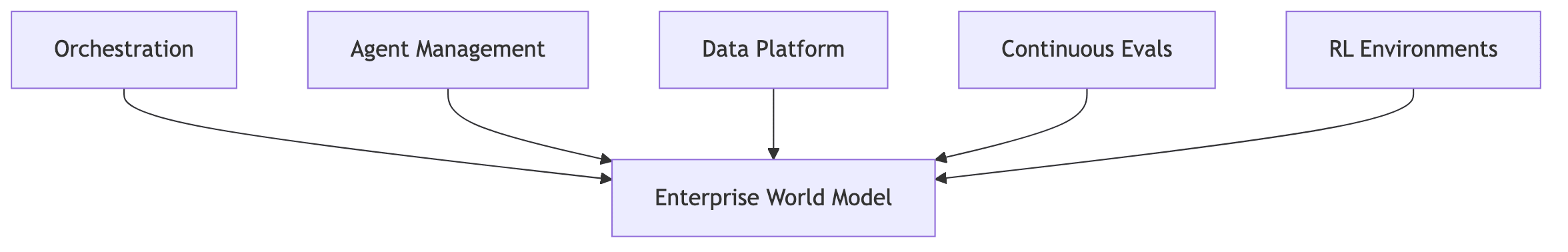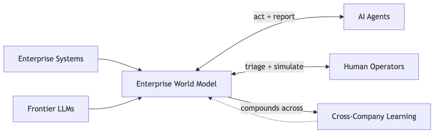 But there’s something holding these back, making them seem like little features. The key distinction is this, a world model. It predicts what will happen if you intervene. Which means all of these - orchestration, agent management, data integration, RL environments, continuous evaluations - are pieces of the same thing. They’re features of the enterprise world model. None of them, on their own, can answer the question: “if I do X, what happens to the business?”. And that’s what we’ll need.